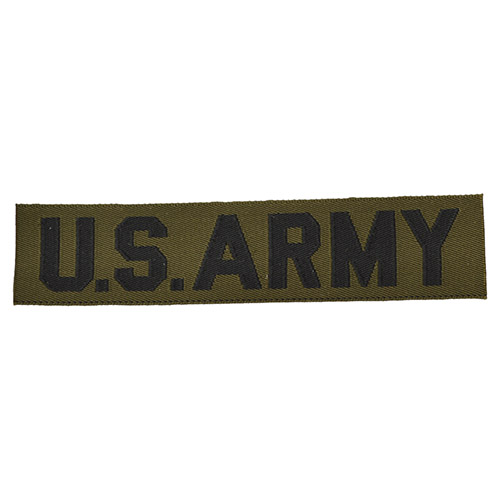 Inscription US ARMY. Couleur : olive (vert). Dimensions : environ 12 x 2,5 cm.