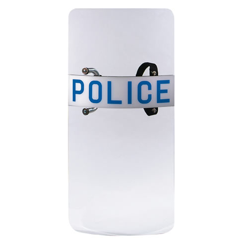 Bouclier anti-émeute en polycarbonate résistant pour la protection de tout le corps. Poignée en aluminium, sangle pour le fixer au bras. Inscription POLICE sur le devant.