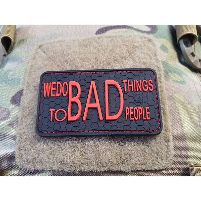 Écusson 3D en plastique avec l'inscription « We do bad things to bad people » (Nous faisons des choses négatives aux personnes négatives). Dimensions : environ 7,5 x 4,2 cm, avec velcro au dos.