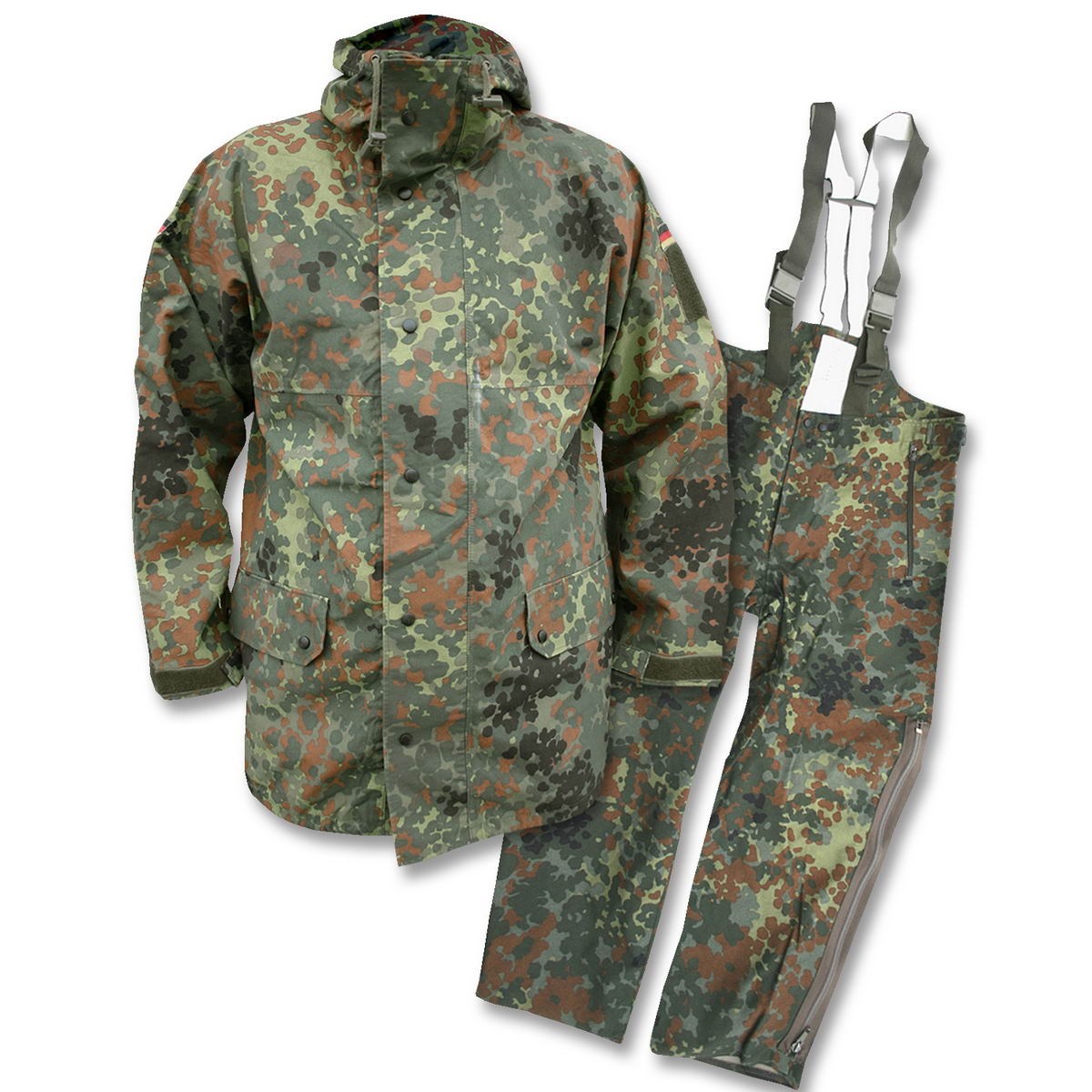 Veste et pantalon imperméables utilisés par l'armée BW. Matériau imperméable trilaminé. Couleur : Flecktarn. Produit d'occasion. Plus d'informations