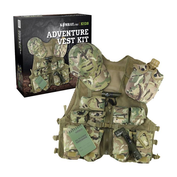 Coffret cadeau pour enfants contenant tout ce dont un petit soldat, une petite soldate, un explorateur, un découvreur ou un Indiana Jones pourrait avoir besoin. Le coffret comprend un gilet tactique, une casquette, une lampe de poche, un bloc-notes imperméable, un sifflet 7 en 1, une gourde et un mousqueton tactique. Gilet tactique :