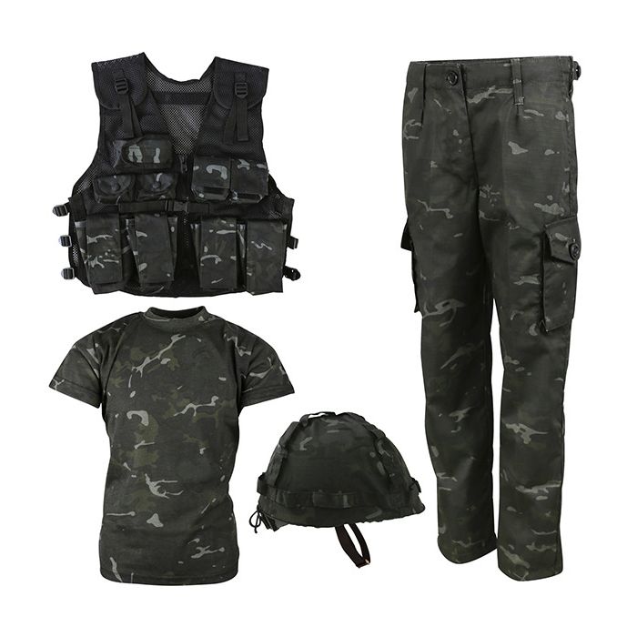 Équipement de base complet pour petit soldat, parfait pour toutes les opérations tactiques secrètes des enfants. Le kit comprend : pantalon tactique, t-shirt, gilet tactique, casque en plastique avec housse. Le tout en camouflage noir BTP.
