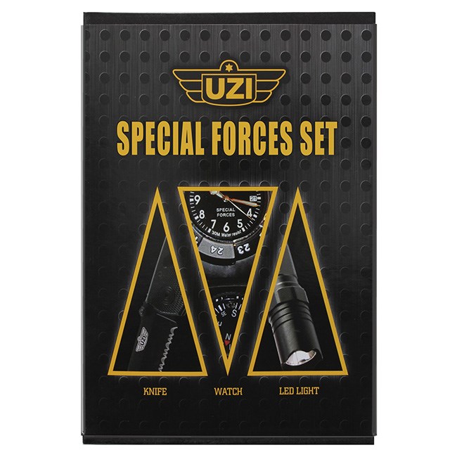 Ce coffret cadeau haut de gamme comprend une montre SPEC-OPS DIVER avec boussole, un couteau pliant et une lampe LED.