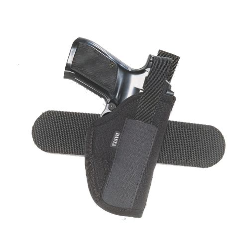 Étui latéral extérieur pour ceinture, pour droitiers, de la marque DASTA. Peut être utilisé pour le port dissimulé ou apparent d'une arme de poing courte. L'étui se fixe à la ceinture à l'aide d'une boucle d'environ 5 cm de large. Une sangle en deux parties avec bouton-pression permet de maintenir l'arme dans l'étui. La longueur de la sangle peut être ajustée à l'aide d'une bande Velcro en fonction de l'arme. Une sangle correctement ajustée permet de la détacher rapidement avec le pouce de la main qui tire tout en conservant une bonne prise sur la crosse de l'arme. L'étui est fabriqué en nylon et doublé d'un tissu doux pour éviter de rayer la surface de l'arme.