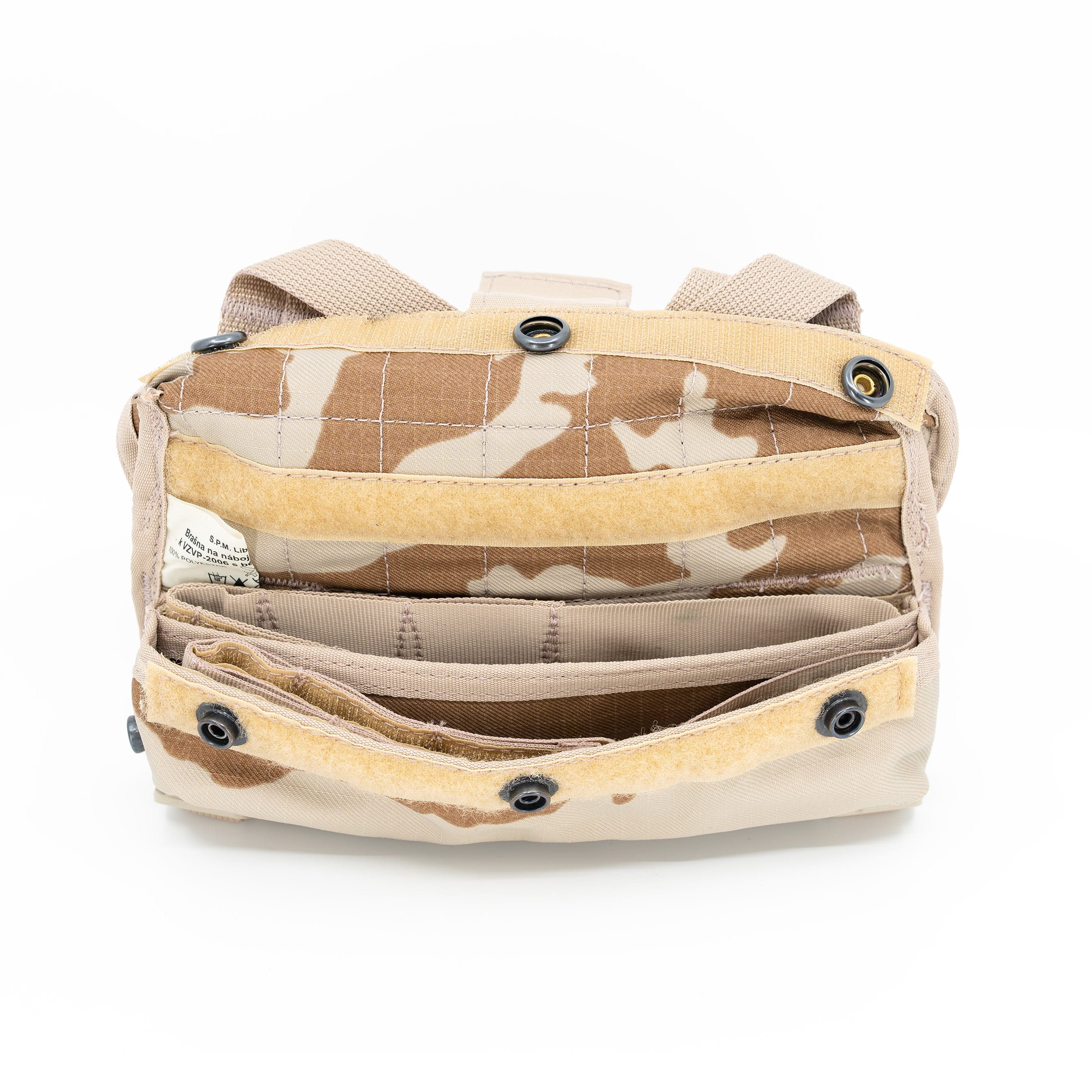 L'étui se ferme à l'aide d'une patte à velcro et de boutons-pression. La patte peut également être fixée en position ouverte à l'aide d'un velcro interne pour un accès plus rapide aux cartouches transportées. À l'intérieur, l'étui est divisé en deux par une cloison longitudinale, chacune avec sa propre sangle munie de trous pour insérer les cartouches individuelles. Quatre sangles verticales et des boucles à enfiler permettent de le fixer à un gilet, une ceinture ou toute autre plateforme.