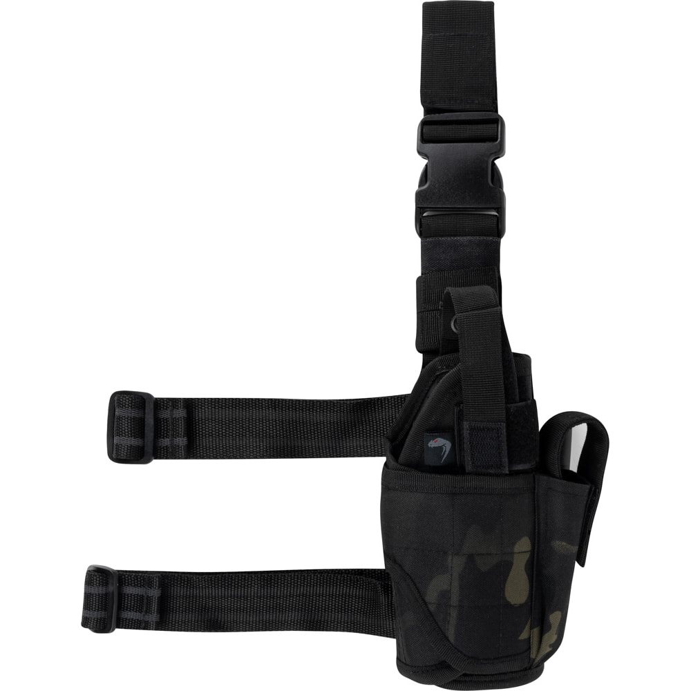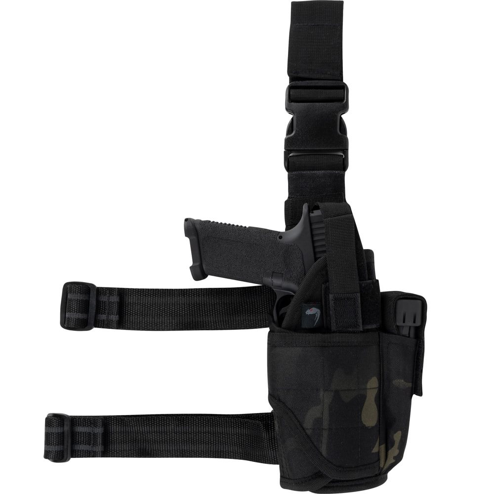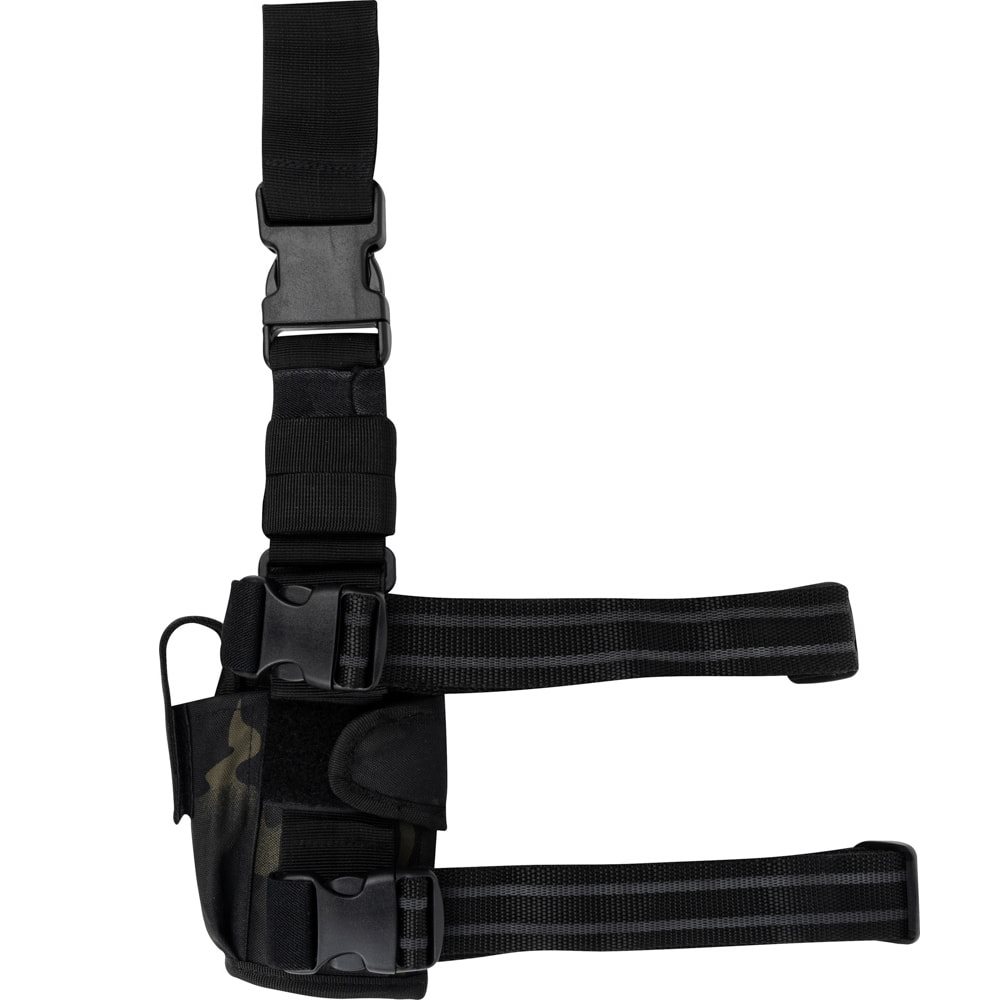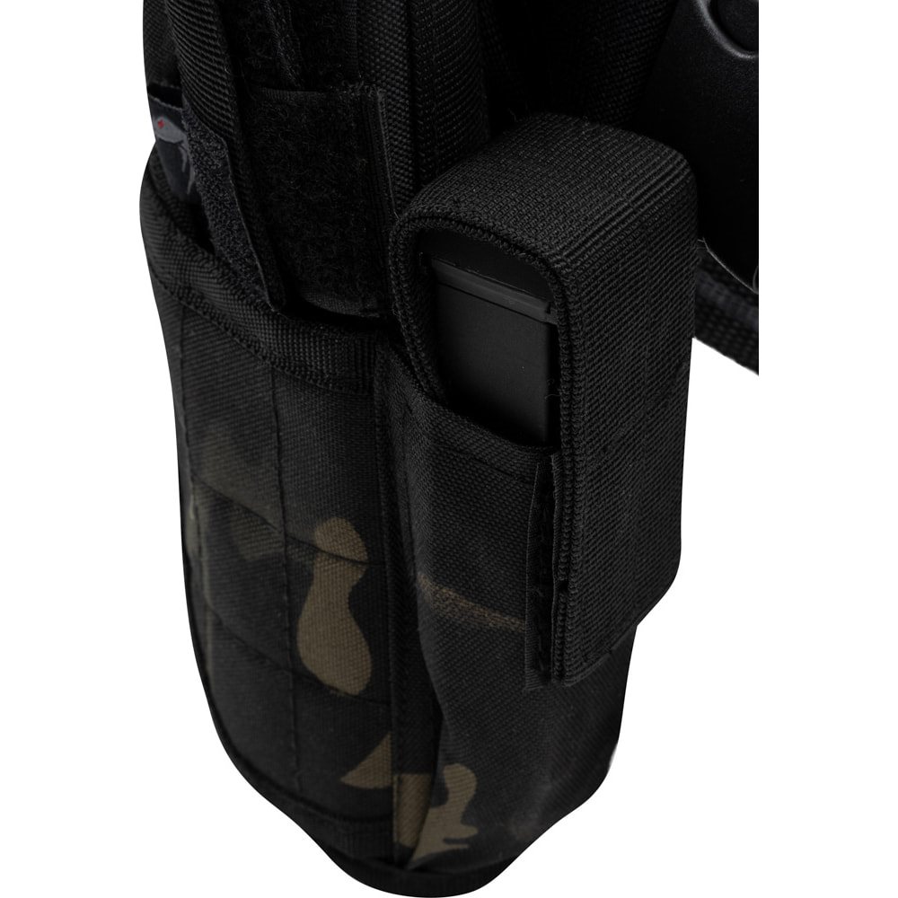 Étui pour pistolet pour droitiers. Design camouflage ultramoderne. Fermeture par sangle à bouton-pression. Sangles coulissantes à velcro pour s'adapter au type de pistolet. Sangles de cuisse antidérapantes équipées d'une boucle FASTEX. Plus d'informations