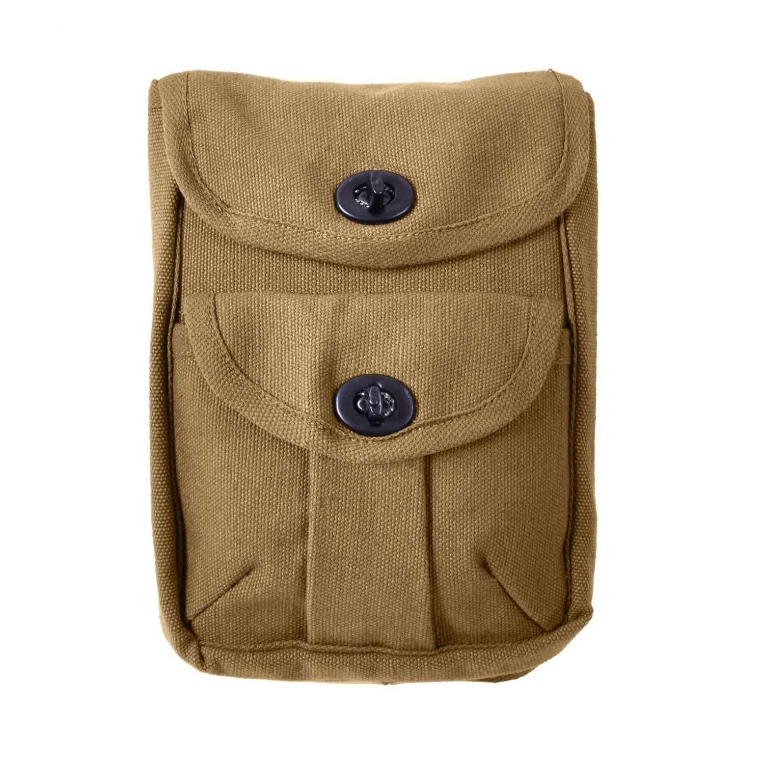 Étui en toile de coton épaisse avec deux poches. Fermeture à l'aide de boucles métalliques. Une boucle à l'arrière permet de l'attacher à la ceinture.
