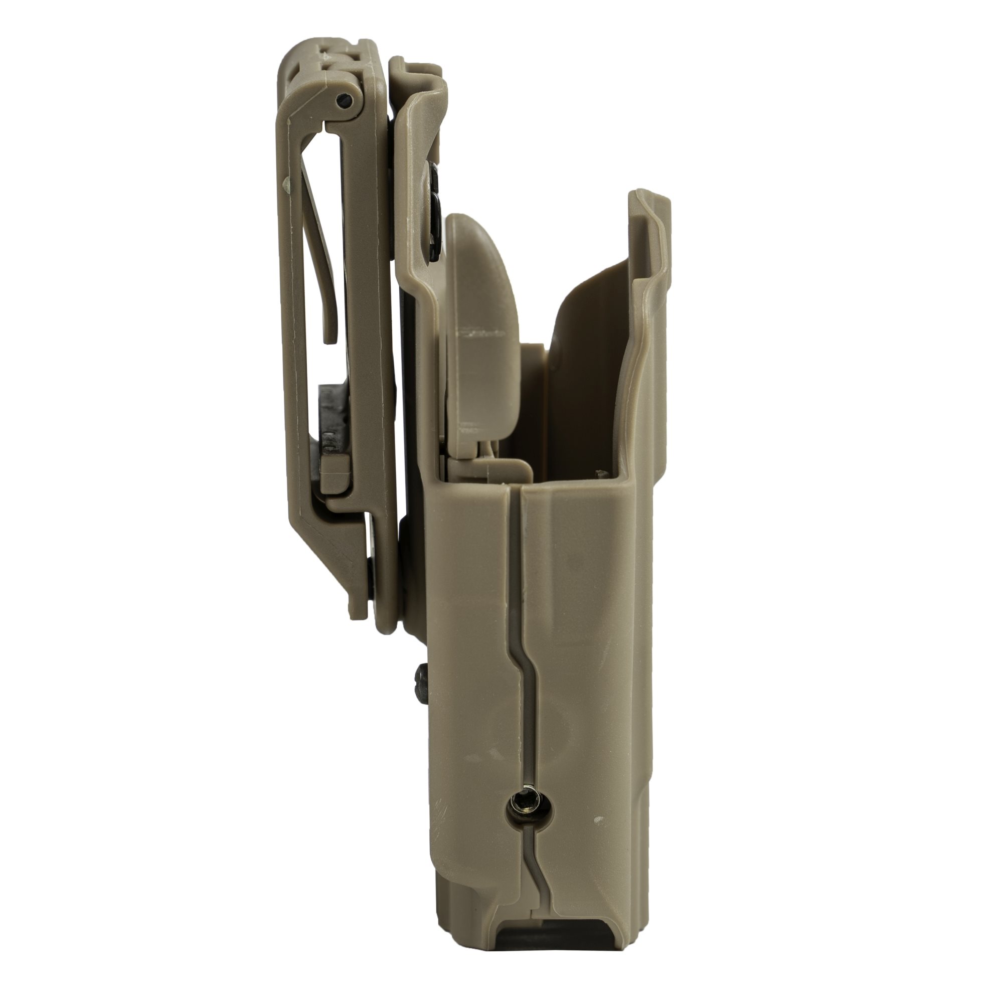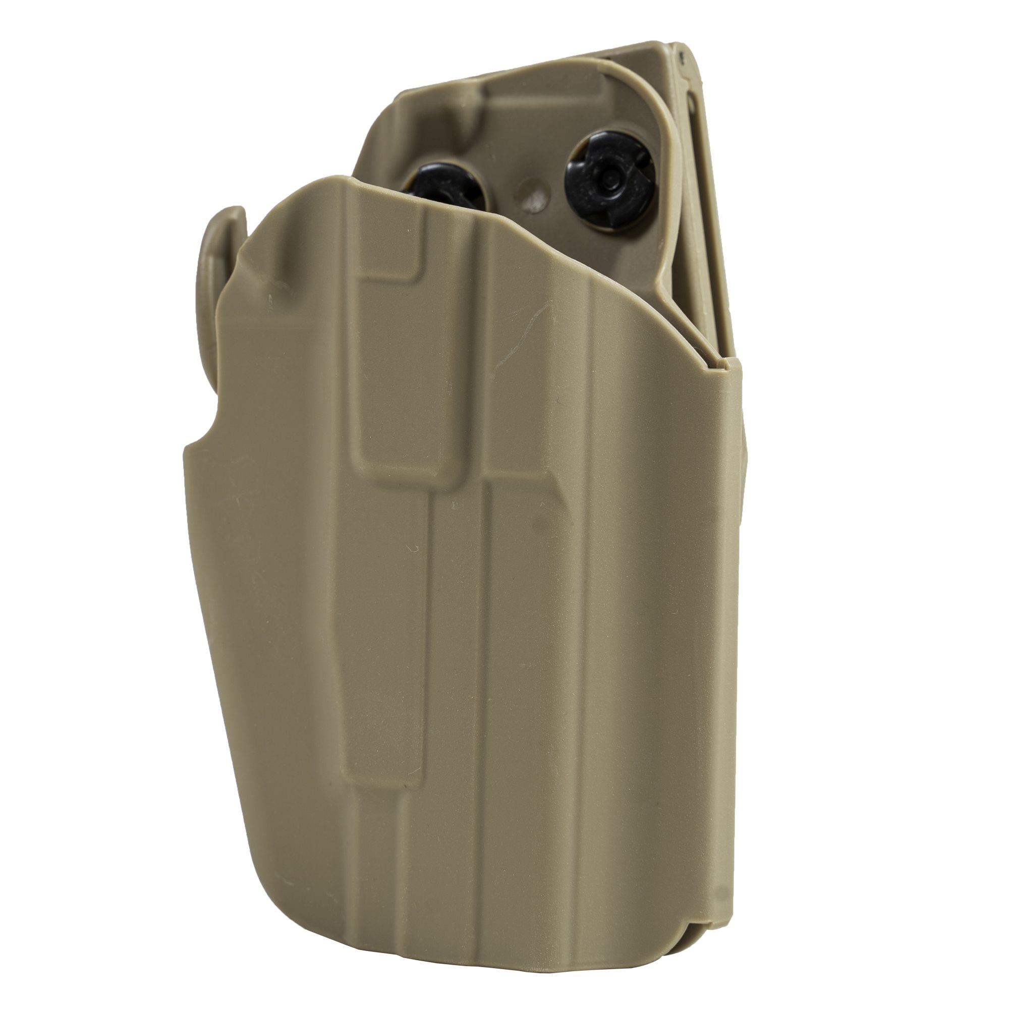Étui en plastique extérieur de la marque FMA pour droitiers. Équipé d'un dispositif de sécurité qui bloque automatiquement la crosse de l'arme lorsqu'elle est insérée dans l'étui. Le dispositif de sécurité se déverrouille à l'aide d'un levier à ressort, son emplacement permet de l'actionner avec le majeur de la main qui tire tout en conservant une bonne prise sur la crosse de l'arme. La force de serrage de l'arme peut être réglée à l'aide d'une vis située sur le côté de l'étui à l'aide de la clé Allen fournie. L'étui se fixe à la ceinture en le passant à travers un adaptateur en plastique, la largeur du passage est réglable dans une plage de 38 à 55 mm. L'étui peut être incliné dans une certaine mesure par rapport à l'adaptateur / la ceinture.