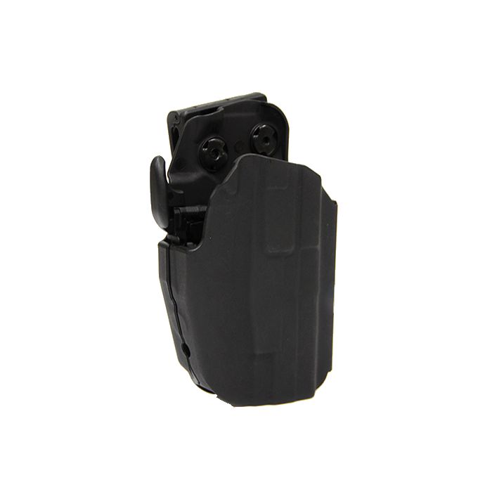 Étui en plastique extérieur de la marque FMA pour droitiers. Équipé d'un dispositif de sécurité qui bloque automatiquement la crosse de l'arme lorsqu'elle est insérée dans l'étui. Le dispositif de sécurité se déverrouille à l'aide d'un levier à ressort, son emplacement permet de l'actionner avec le majeur de la main qui tire tout en conservant une bonne prise sur la crosse de l'arme. La force de serrage de l'arme peut être réglée à l'aide d'une vis située sur le côté de l'étui à l'aide de la clé Allen fournie. L'étui se fixe à la ceinture en le passant à travers un adaptateur en plastique, la largeur du passage est réglable dans une plage de 38 à 55 mm. L'étui peut être incliné dans une certaine mesure par rapport à l'adaptateur / la ceinture.