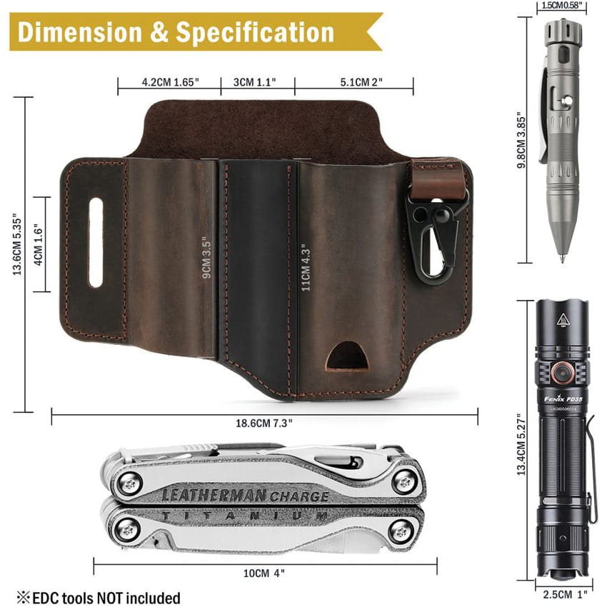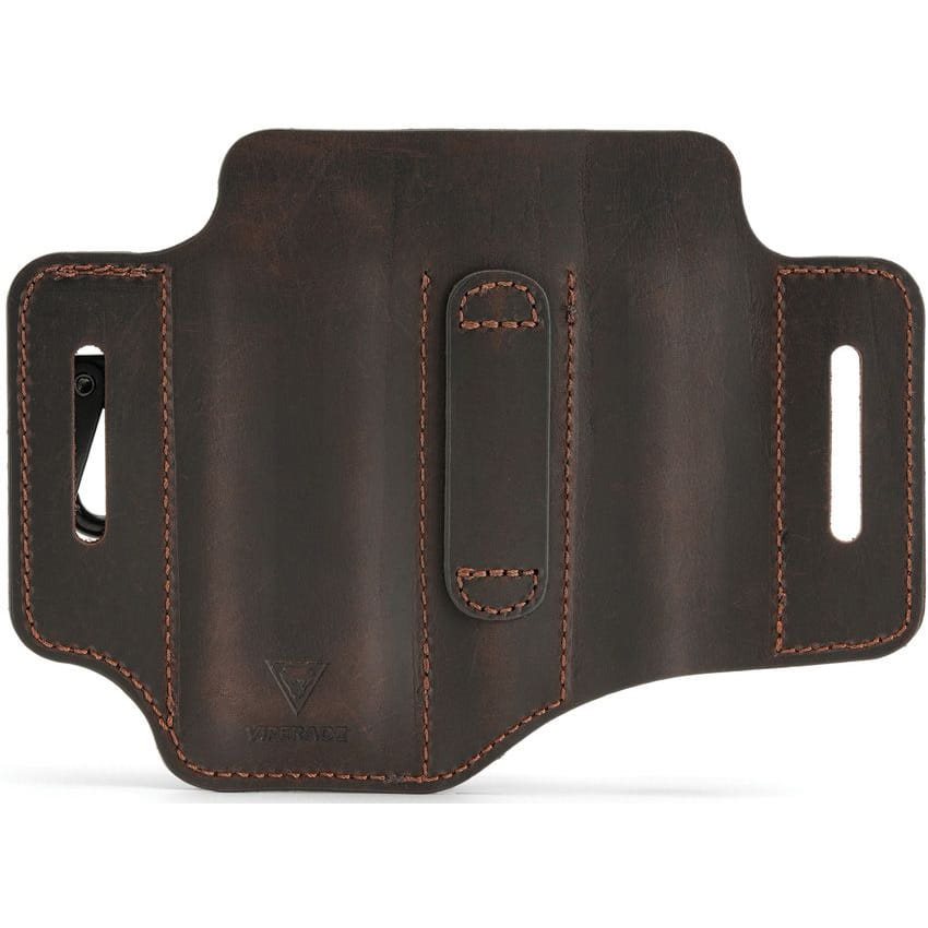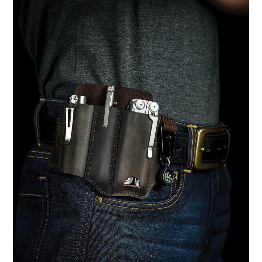 Étui pratique à ceinture conçu pour transporter un outil multifonction, un stylo tactique, une lampe de poche, etc. Le compartiment pour lampe de poche n'a pas de fond, ce qui permet d'y ranger même les lampes de poche plus volumineuses. En revanche, le compartiment pour stylo a un fond fermé et peut contenir des stylos d'une longueur maximale de 9,8 cm. Le compartiment principal pour le multi-outil est muni d'une ouverture inférieure pour faciliter le retrait des outils de l'étui. Le clip métallique peut être utilisé, par exemple, pour les clés. L'étui convient aux ceintures jusqu'à 4 cm. Il est fabriqué en cuir souple et résistant.