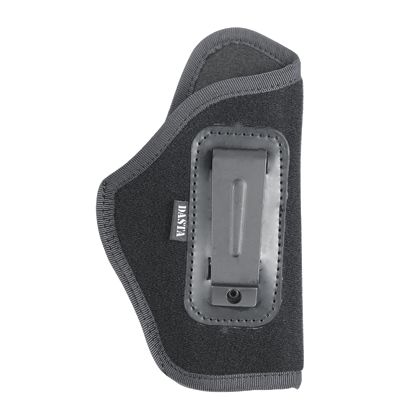 Étui de ceinture intérieur pour droitiers de la marque DASTA. Il est conçu pour le port dissimulé d'une arme de poing courte. L'étui se porte généralement à l'avant, sur le ventre, à l'intérieur du pantalon, de manière à ce que la boucle en acier soit enclenchée derrière la ceinture. L'arme est maintenue dans l'étui par la pression de la ceinture, l'étui n'est pas équipé d'un dispositif de sécurité supplémentaire pour l'arme. L'étui est fabriqué en nylon avec une doublure en flanelle douce pour éviter de rayer la surface de l'arme.