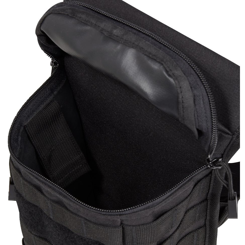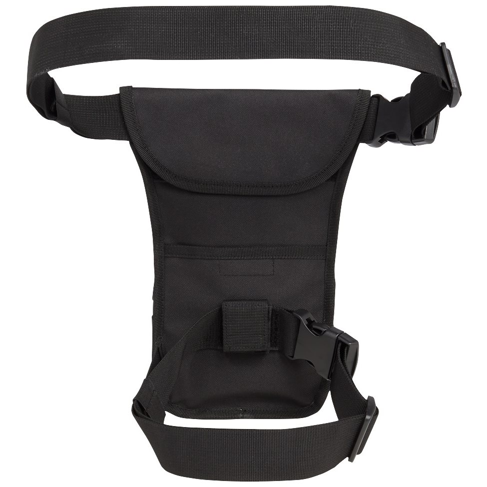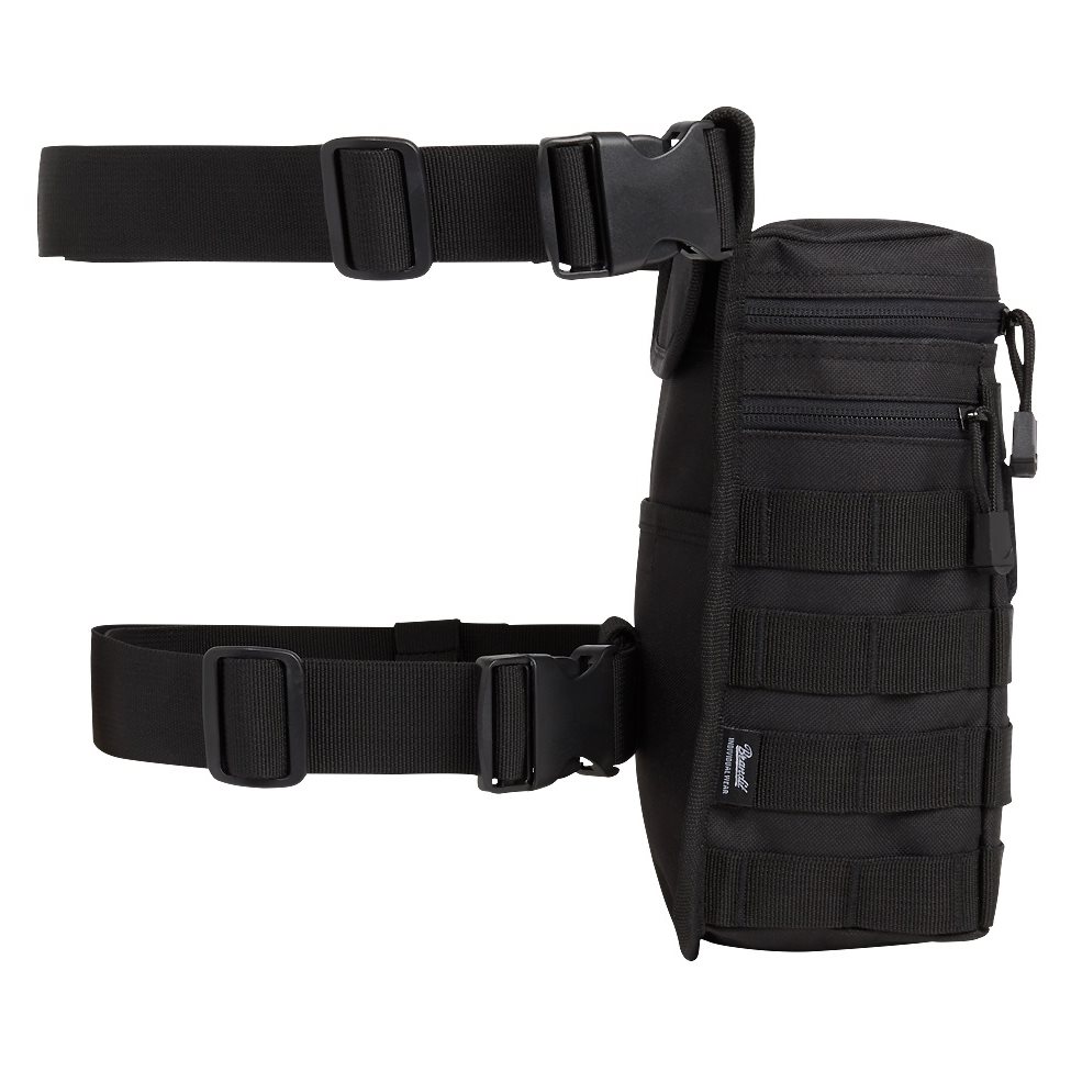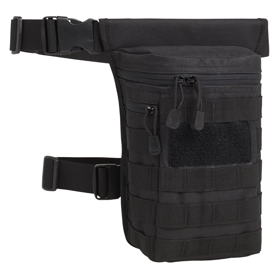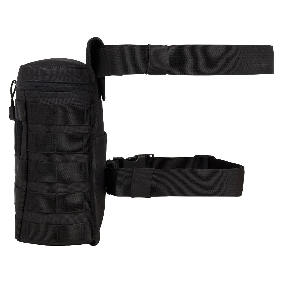 Étui universel pour cuisse fabriqué en polyester 600D résistant. À l'extérieur de l'étui, vous trouverez un grand nombre de sangles MOLLE/PALS que vous pouvez utiliser pour fixer des équipements supplémentaires, ainsi qu'un large panneau VELCRO pour vos écussons. Sur le côté droit se trouve une petite poche plate fermée par une fermeture éclair. L'espace de rangement principal est accessible par une fermeture éclair à double sens. La dernière poche se trouve à l'arrière.