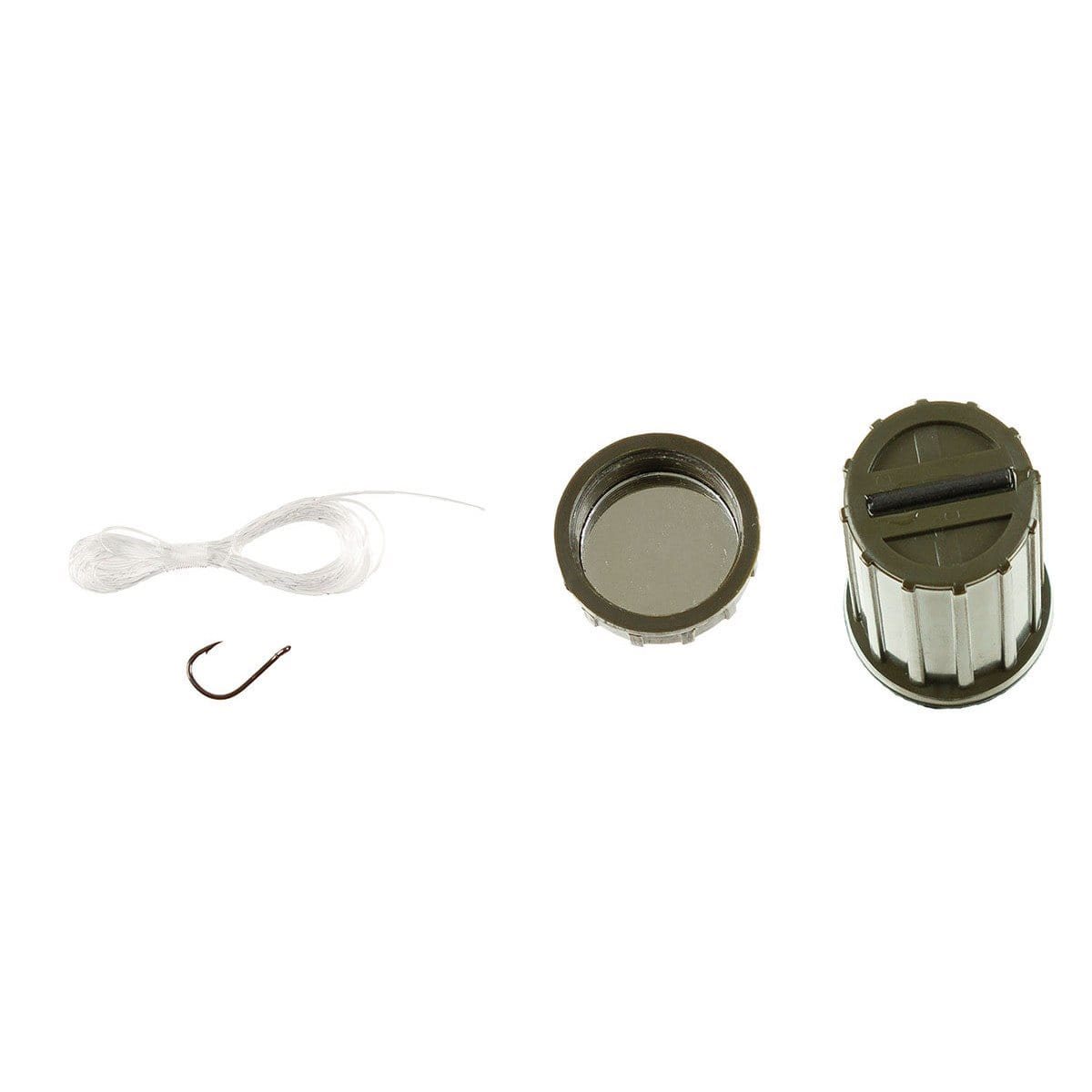 La boîte étanche contient : des allumettes, un briquet, un hameçon, un miroir, couleur : olive (vert).