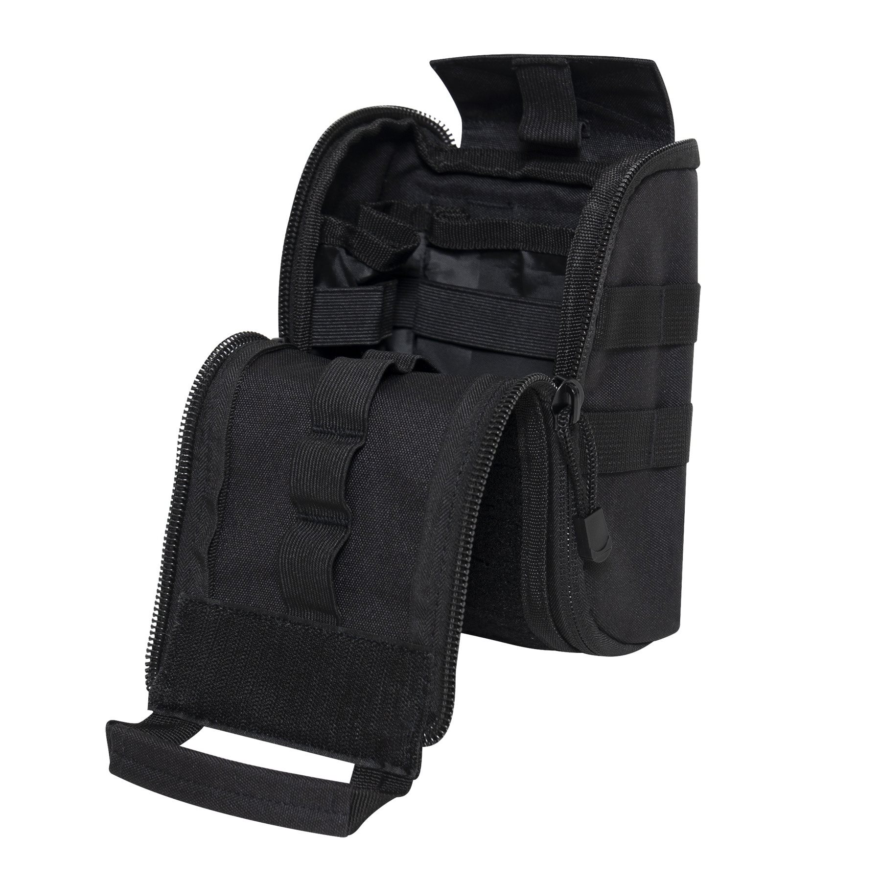 La face avant de l'étui est recouverte d'une fixation modulaire découpée au laser, combinée à du velcro. Pour l'ouvrir, vous pouvez utiliser les fermetures éclair latérales ou la poignée supérieure, qui vous permet d'accéder rapidement au contenu en tirant brusquement vers le bas. Le système de fixation modulaire latéral peut être utilisé pour fixer des étuis compatibles plus petits. À l'intérieur, vous trouverez treize élastiques et quatre petits compartiments destinés au rangement du matériel médical.