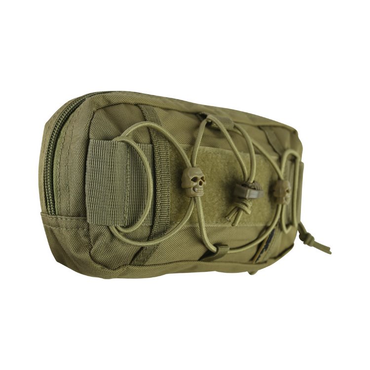 À l'avant de l'étui se trouve un « tunnel » qui peut servir, par exemple, à ranger des gants. L'étui est complété par un cordon élastique (bungee) sur lequel sont enfilées deux perles en forme de grenade et un frein en forme de grenade. L'étui est équipé d'un cordon élastique (bungee cord) sur lequel sont enfilées deux perles en forme de crâne et un frein en forme de grenade. Sous le cordon élastique se trouve un panneau velcro pour les écussons à fixation velcro. L'arrière est constitué de 4 bandes MOLLE. La poche principale est équipée d'autres compartiments.