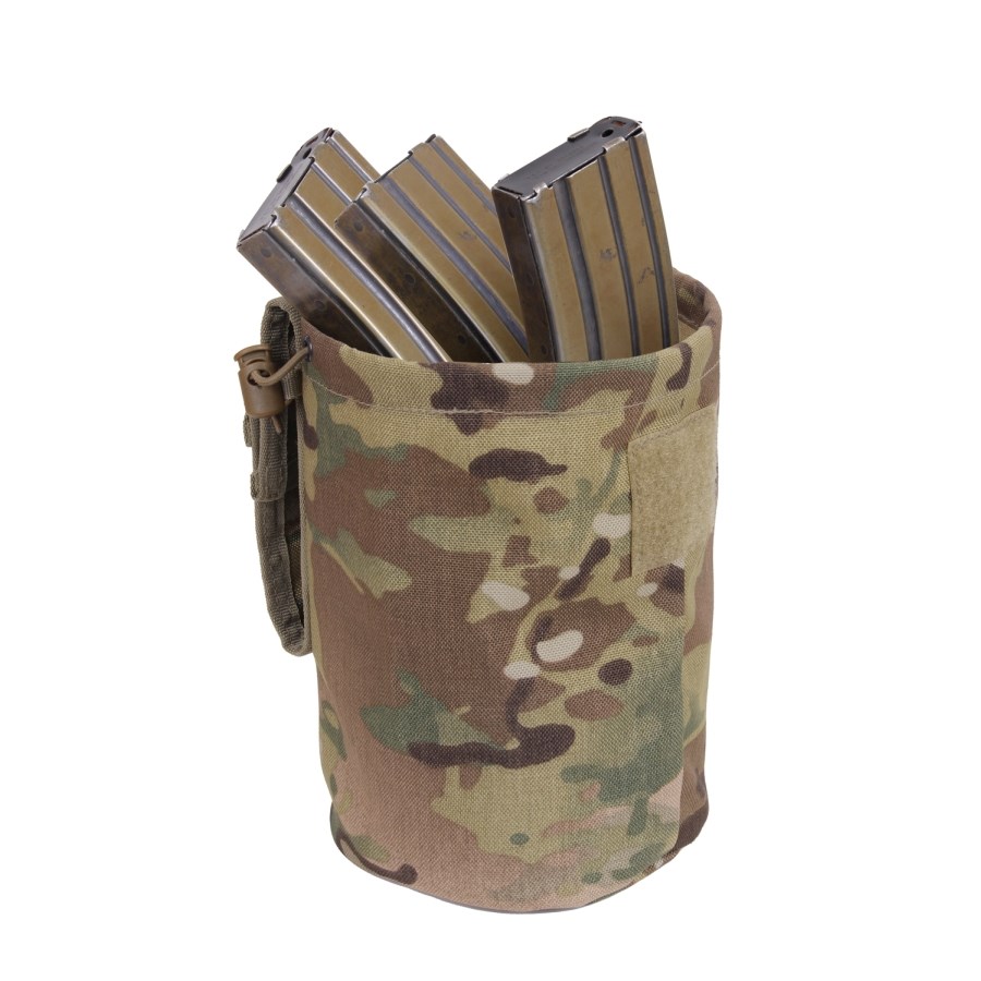 Étui pliable pour chargeurs vides - étui de rangement. Le bord supérieur peut être resserré à l'aide d'un cordon en caoutchouc et fermé par un rabat à velcro. Dimensions : 21 x 14 cm (hauteur x diamètre).