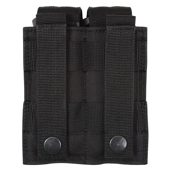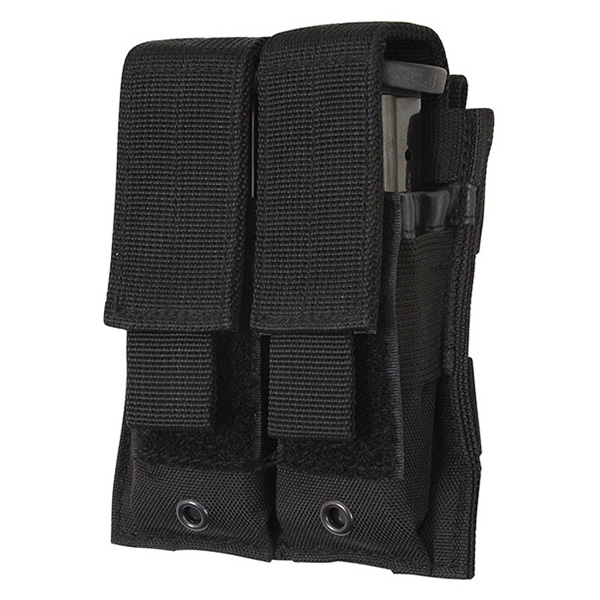 Double étui pour chargeurs de pistolet, compatible MOLLE. Rabats avec fermeture velcro. Dimensions : 11 x 12,5 cm. Matériau : polyester 600D.