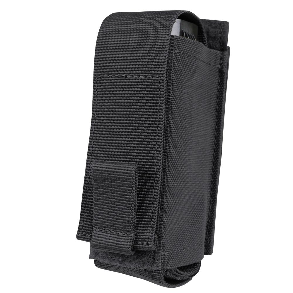 Étui permettant un accès rapide au spray transporté. Grâce à sa sangle arrière d'environ 10 cm de long, l'étui est compatible avec le système de fixation modulaire MOLLE/PALS, ce qui permet de le fixer facilement à toute une série d'équipements tactiques tels que des porte-plaques, des harnais de poitrine, des sacs à dos, etc. La fermeture de l'étui est assurée par un rabat réglable avec une patte. Le rabat est fixé à l'aide d'une bande Velcro et peut être détaché et retiré si nécessaire. Le fond élastique de l'étui s'adapte facilement à la taille de l'équipement inséré.