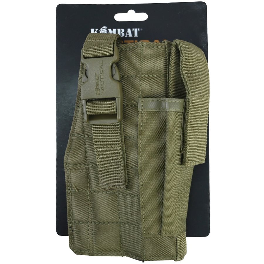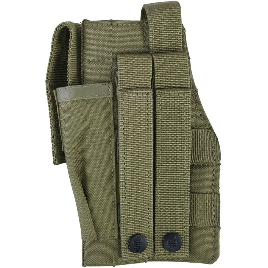 Étui modulaire conçu pour le transport d'un pistolet. Il est fabriqué en 600D Tac-Poly, un matériau résistant aux chocs et à l'abrasion. À l'avant de l'étui se trouve une poche destinée à accueillir le chargeur du pistolet. Celle-ci est sécurisée par un rabat à fermeture velcro. L'arme est maintenue dans l'étui à l'aide d'une sangle avec boucle en plastique. À l'arrière, des sangles compatibles avec les ceintures et le système de fixation modulaire PALS/MOLLE sont disponibles.