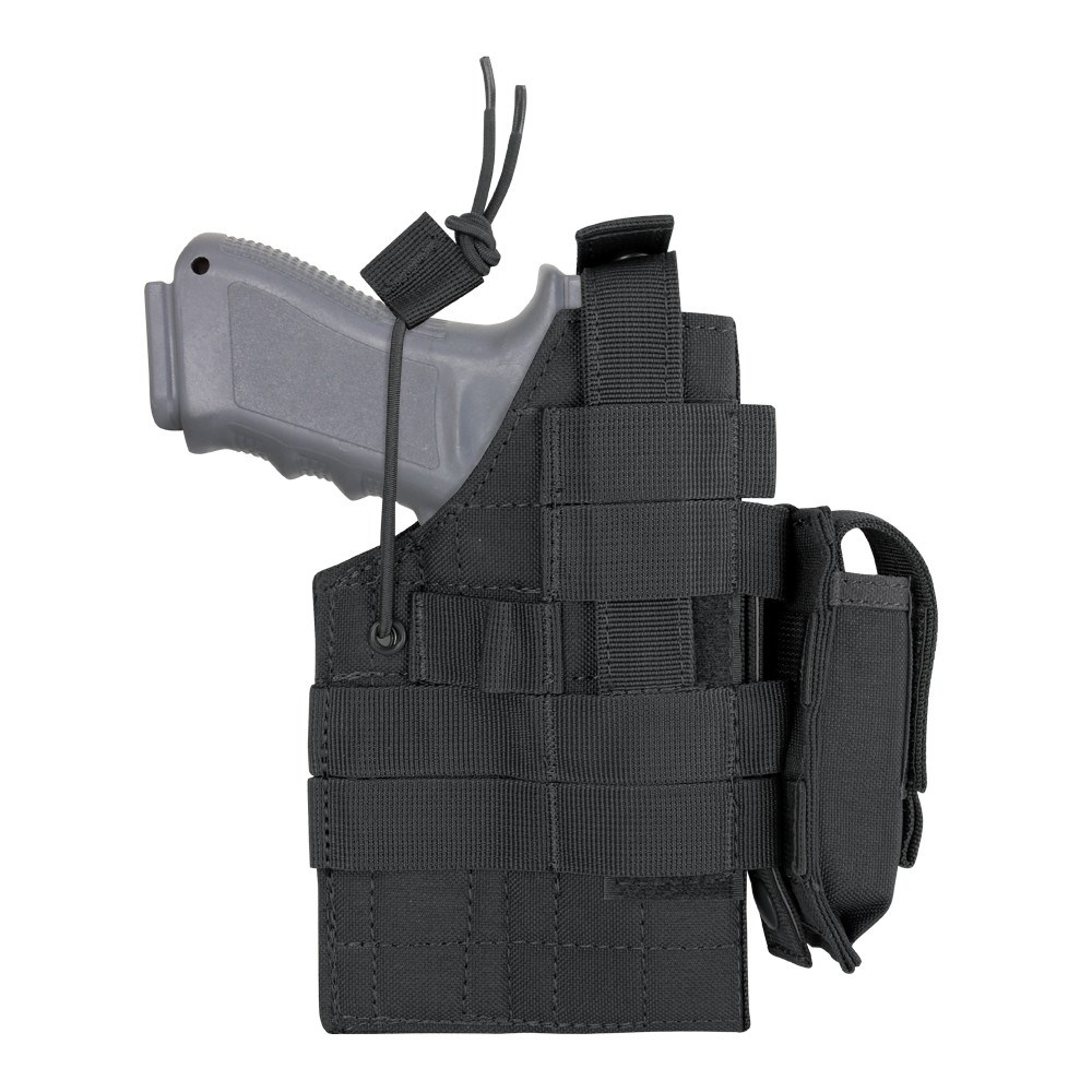 Étui pour pistolets Glock de calibre 9 mm, .40 S&W et .45 GAP. Peut être fixé sur le système MOLLE, à droite ou à gauche. Fixation de l'arme à l'aide d'une sangle à bouton-pression et d'un cordon élastique. Pochette amovible séparée pour le chargeur.