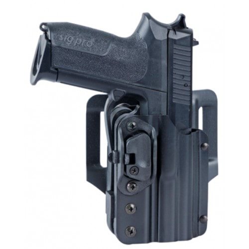 Étui tactique en plastique pour ceinture avec sécurité automatique PHDLB, conçu pour les modèles CZ P-07 et SIG P228. Plus d'informations
