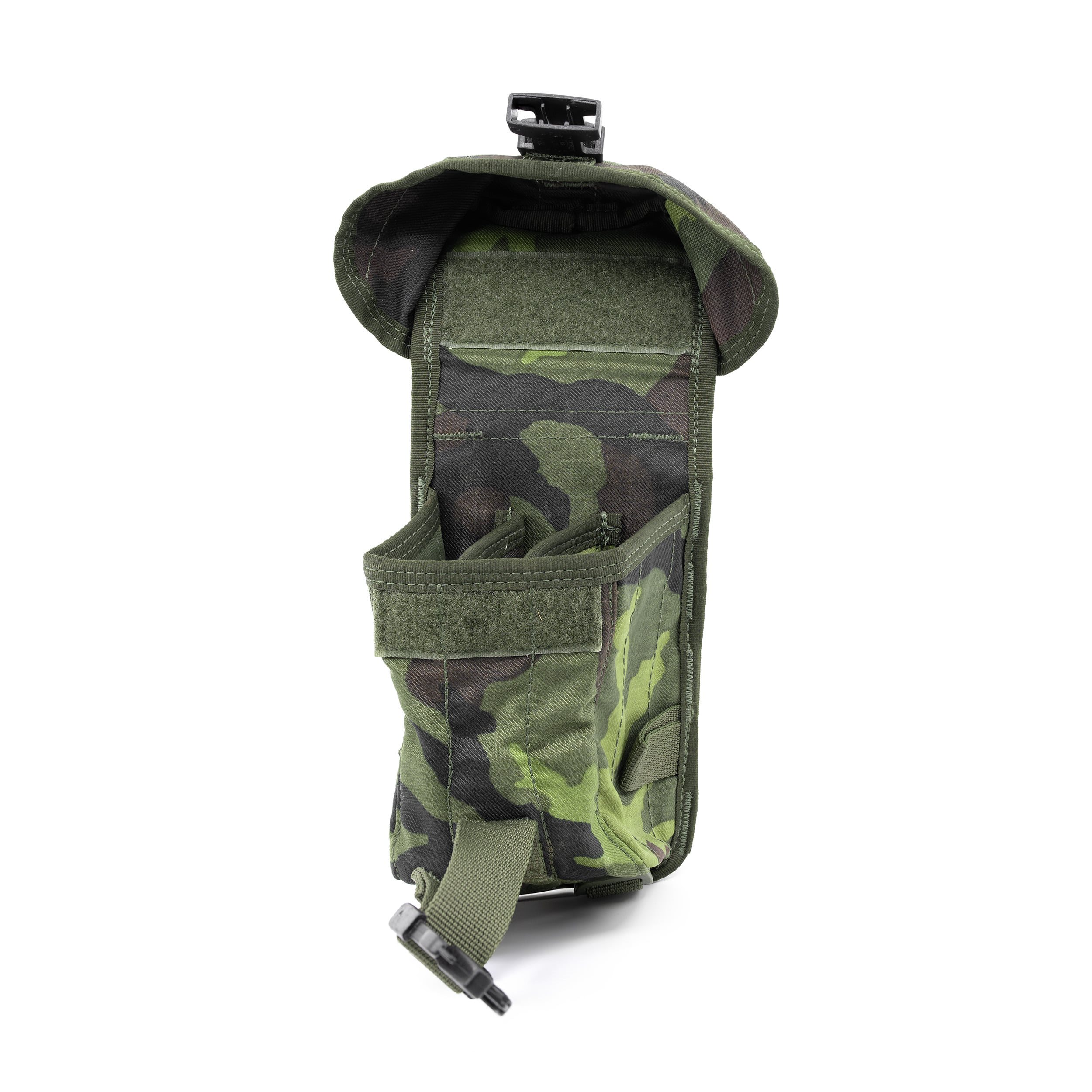 Sacoche pour trois chargeurs de fusil M-4/16. Les chargeurs se placent côte à côte à la verticale. Fermeture par rabat avec boucle Fastex. Fixation à l'aide du système MOLLE NPP-2006. Dimensions approx. : 22 x 11 x 9 cm. Stocké par l'armée tchèque, neuf. Fabricant : SPM Liberec.