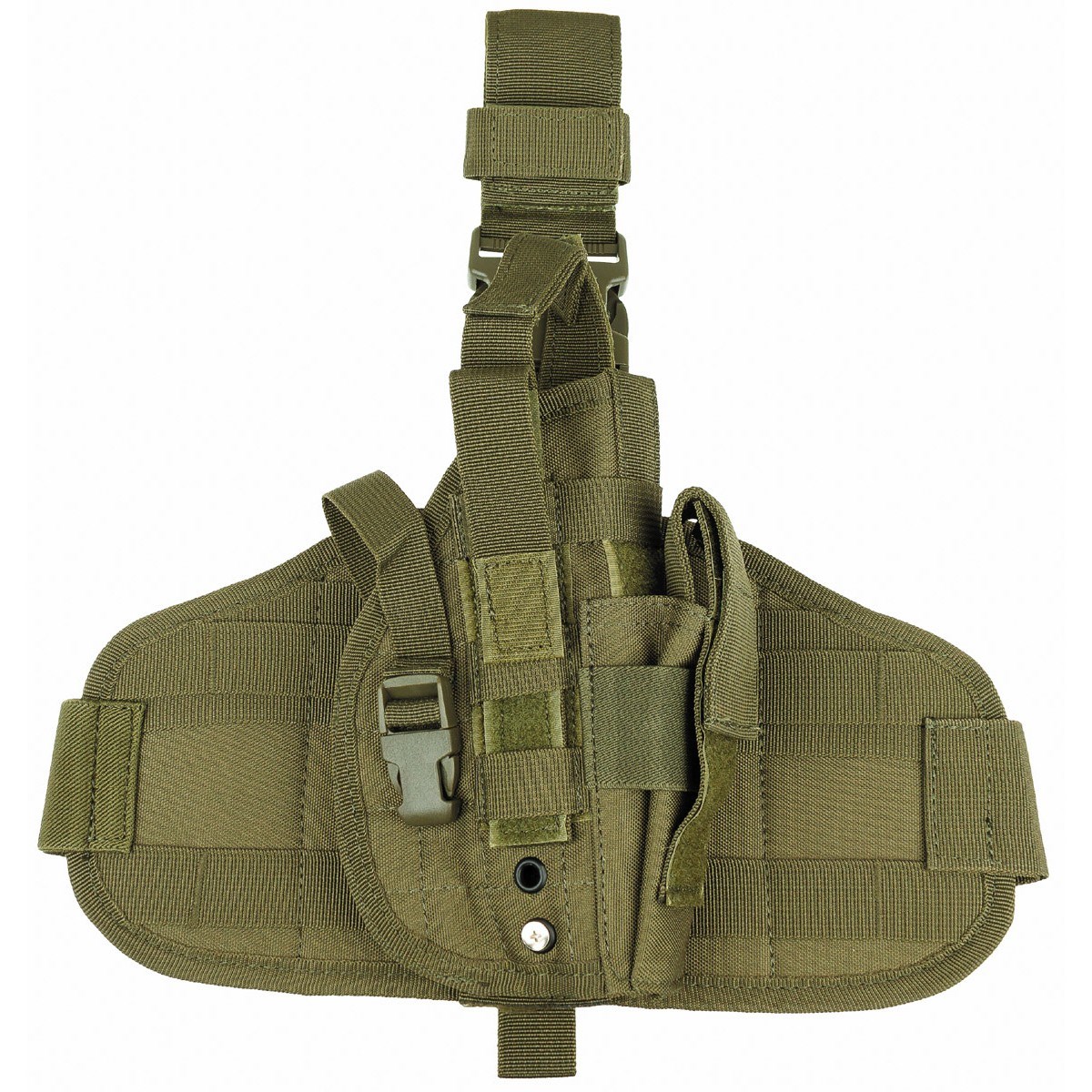 Étui pour pistolet à fixer sur la cuisse droite. Sangles réglables avec boucles FASTEX. Poches pour trois chargeurs avec rabat, sangles élastiques. Matériau : 100 % polyester. Plus d'informations