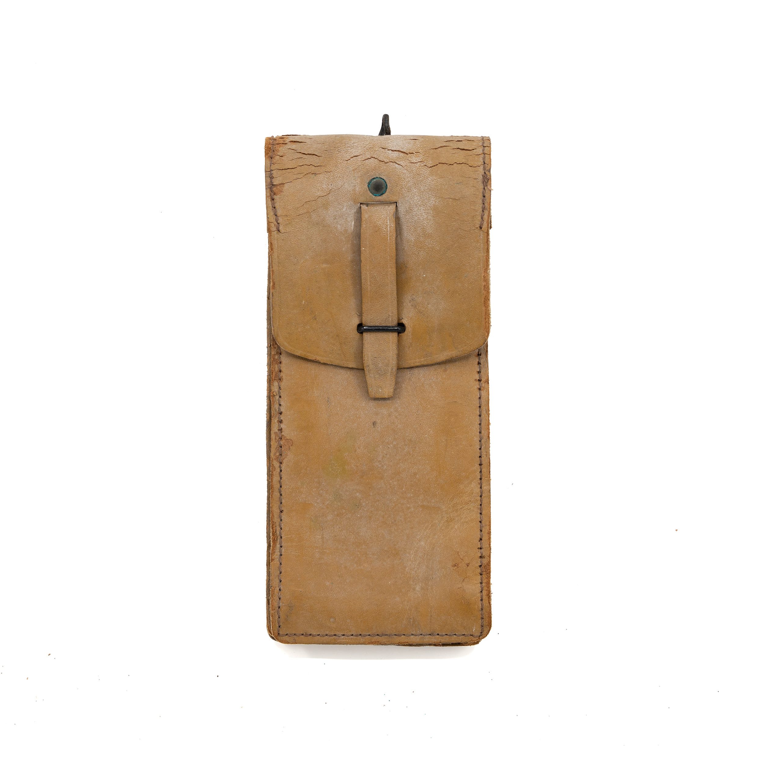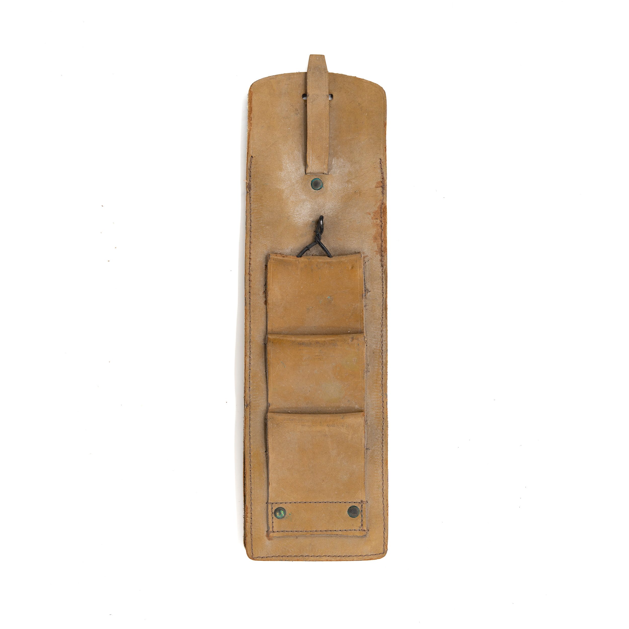 Étui en cuir d'origine de l'armée française pour cartouches - d'occasion. Avec fermeture à boucle. Au dos, deux passants pour l'accrocher à la ceinture et un crochet métallique. Dimensions : 25 x 11,5 x 4 cm. Matériau : cuir clair. Plus d'informations
