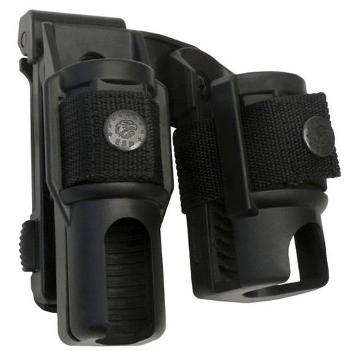 Le double étui pivotant en plastique est composé d'un étui LH-14 (pour lampe) et d'un étui SH-14 (pour spray) reliés par un adaptateur spécial. L'avantage de cette solution est le gain de place sur la ceinture. La position constante de la lampe et du spray facilite l'orientation sur la ceinture lors du choix du produit approprié. Les deux étuis pivotent ensemble par rapport à la ceinture sans que leur position relative ne change. L'adaptateur permet d'ajuster facilement les étuis pour les porter à droite ou à gauche.