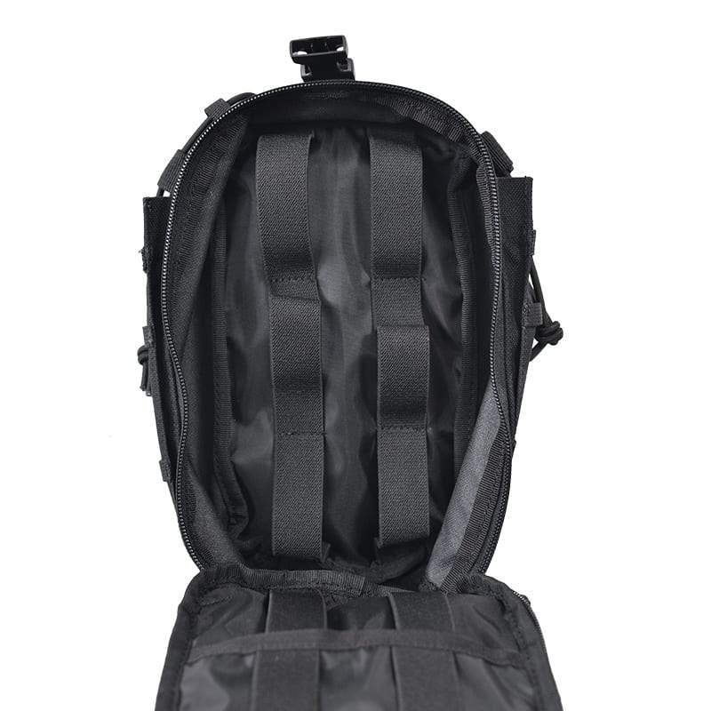 Sur les côtés et à l'avant de la trousse, vous trouverez un système de fixation MOLLE/PALS réduit, idéal pour les petits accessoires supplémentaires. Les côtés sont équipés de petites poches destinées au transport de garrots ou de chargeurs de 5,56 mm (le contenu des poches peut être fixé à l'aide de bandes élastiques). À l'arrière, vous trouverez un panneau amovible à velcro standard MOLLE/PALS, destiné à fixer la trousse de secours à un sac à dos ou à une ceinture. Une fois le panneau retiré, la trousse de secours peut être fixée sur des surfaces à velcro. L'intérieur de la trousse est accessible par une fermeture éclair à double sens et contient des bandes élastiques servant à fixer le matériel médical. Si vous appréciez personnaliser votre équipement à l'aide d'écussons ou d'étiquettes, vous apprécierez certainement le grand panneau avant à velcro. La trousse de secours est livrée sans matériel médical.