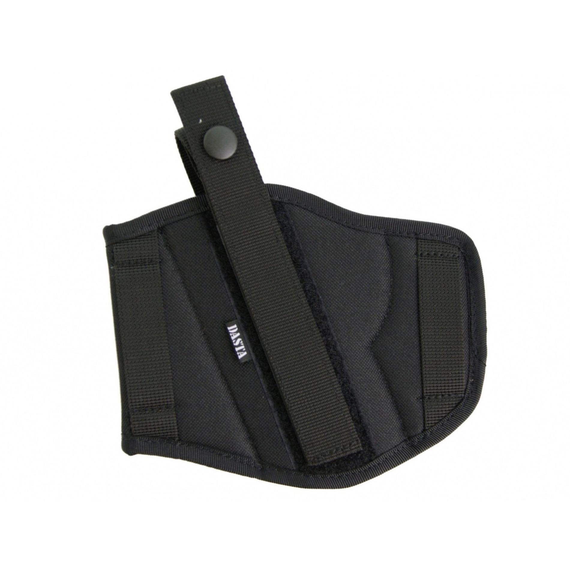 Étui de ceinture extérieur de la marque DASTA. Conçu comme réversible (réglable) pour les droitiers et les gauchers. Peut être utilisé pour le port dissimulé ou apparent d'une arme de poing courte. L'étui est fixé à la ceinture à l'aide de deux boucles à enfiler d'environ 6 cm de large. Une sangle en deux parties avec un bouton-pression permet de maintenir l'arme dans l'étui. La sangle peut être ajustée en longueur et en largeur à l'aide d'une bande Velcro en fonction de l'arme ou des préférences de l'utilisateur. Une fois correctement réglée, la sangle peut être détachée assez rapidement avec le pouce de la main qui tire, tout en conservant une bonne prise sur la crosse de l'arme. L'étui est fabriqué en nylon et doublé d'un tissu doux pour éviter de rayer la surface de l'arme.