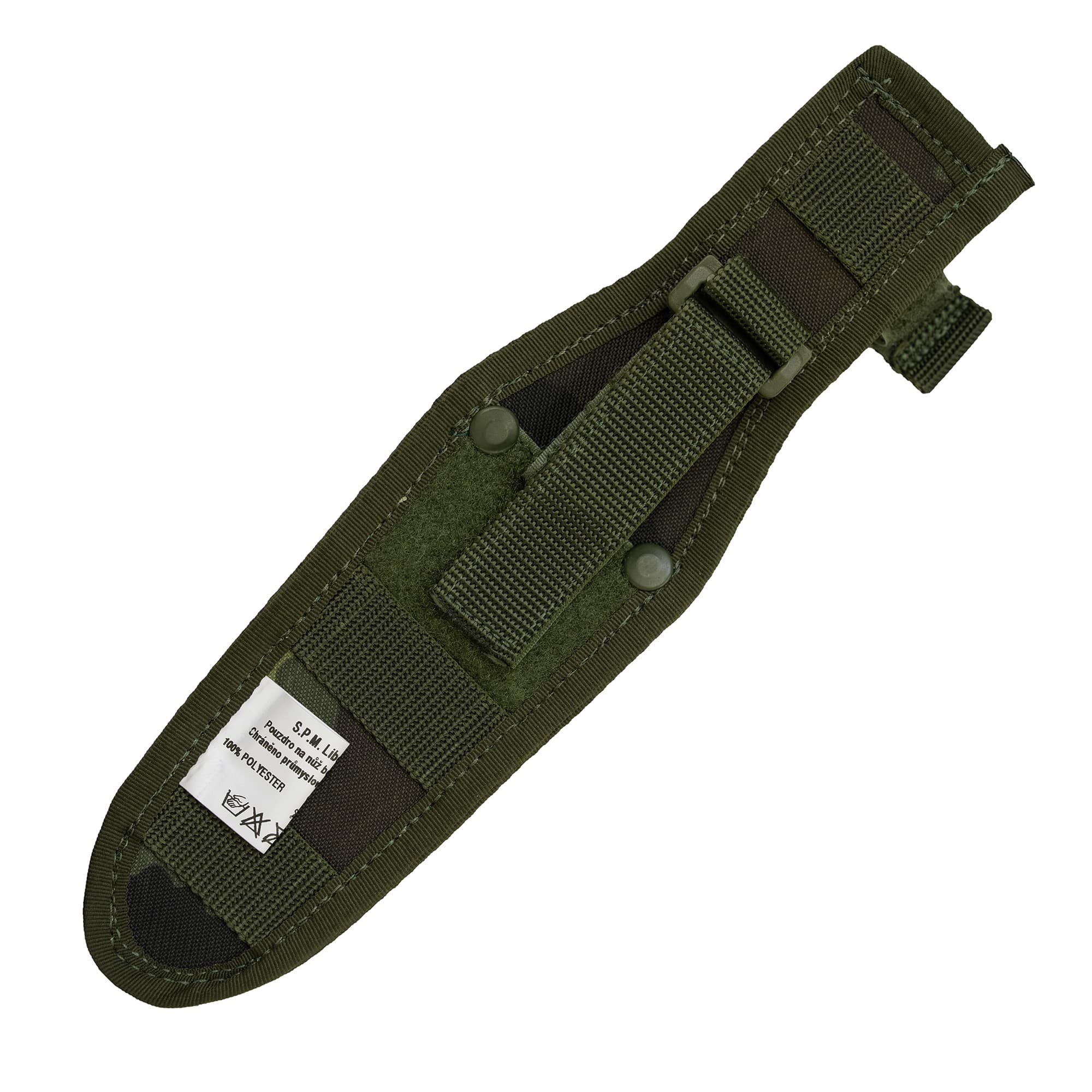 Nouvel étui neuf pour couteau d'assaut MIKOV - UTON utilisé par l'armée tchèque. Motif de camouflage 95. Système de fixation MNS-2000. Peut également être utilisé pour d'autres couteaux fixes avec une longueur de lame maximale de 13 cm et une largeur de 3,5 cm. Le couteau est maintenu dans l'étui par une sangle de fixation avec fermeture à bouton-pression métallique. Il se fixe à la ceinture (largeur max. 6 cm) à l'aide d'une sangle à fermeture velcro, réglable en fonction de la largeur de la ceinture. L'étui est équipé d'une poche à bouton-pression sécurisée par une fermeture velcro. Produit neuf. Fabrication S.P.M. Liberec