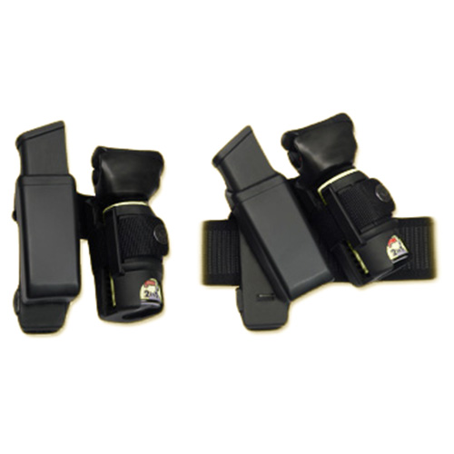 L'étui rotatif double en plastique est composé d'un étui MH-14 (pour chargeur) et d'un étui SH-14 (pour spray) reliés par un adaptateur spécial. L'avantage de cette solution est le gain de place sur la ceinture. Plus d'informations