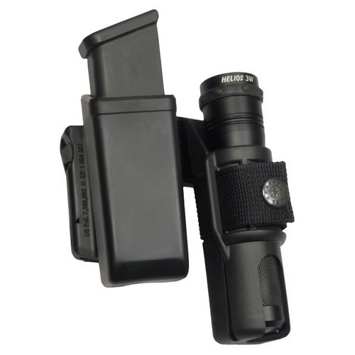 Le double étui pivotant en plastique est composé d'un étui MH-04 (pour le chargeur) et d'un étui LH-04 (pour la lampe) reliés par un adaptateur spécial. L'avantage de cette solution est le gain de place sur la ceinture. La position constante du chargeur et de la lampe améliore l'orientation sur la ceinture lors du choix de l'accessoire approprié. Les deux étuis pivotent ensemble par rapport à la ceinture sans que leur position relative ne change.