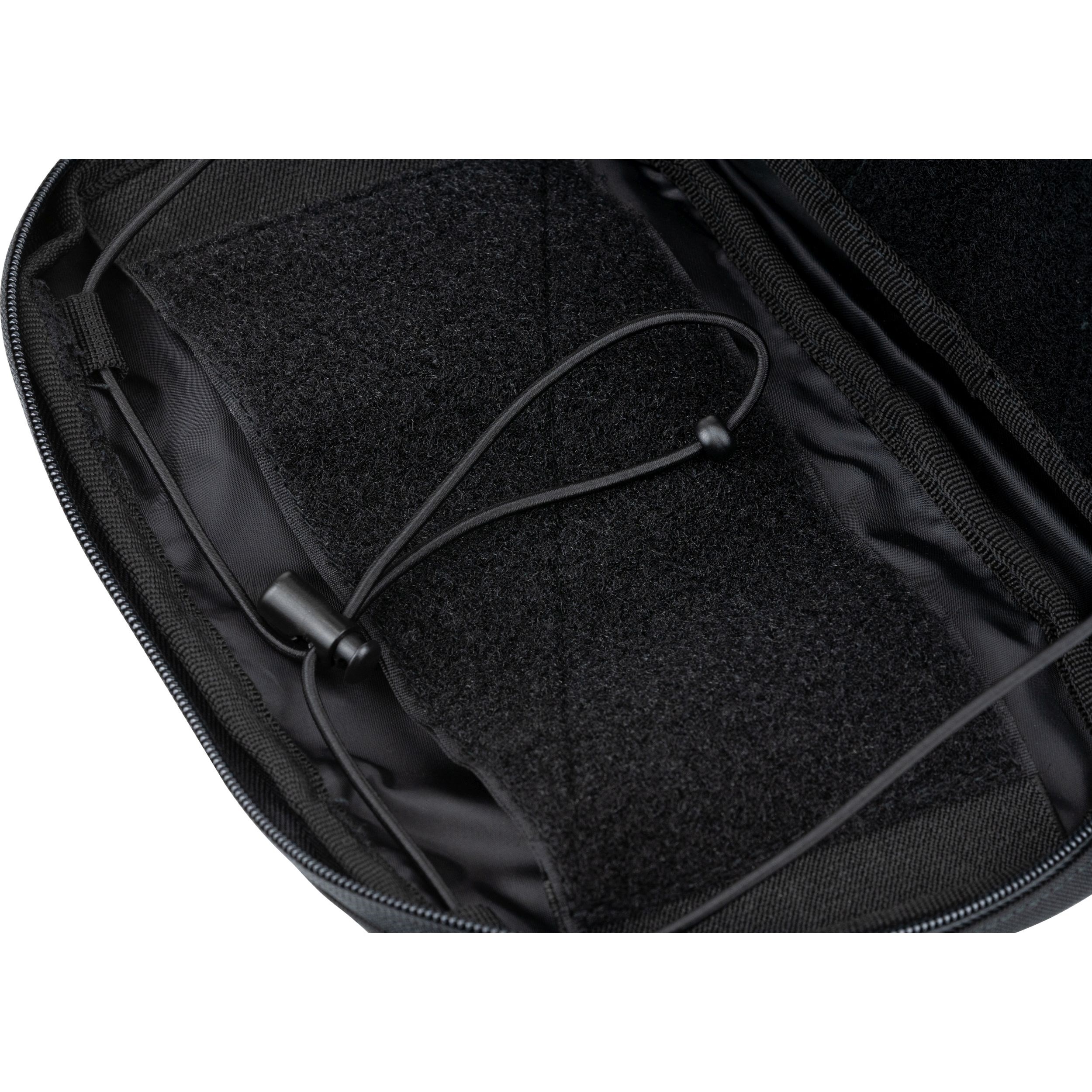 Sur la face avant de l'étui, vous trouverez une fixation MOLLE/PALS découpée au laser et recouverte de velcro. L'arrière dispose de deux rangées de liens modulaires et de deux bandes verticales à boutons-pression. Ces bandes permettent une fixation facile à l'équipement. Le compartiment principal de l'étui, accessible par une fermeture éclair à double sens, est recouvert de velcro à l'intérieur et est donc compatible avec les pochettes VELCRO pour chargeurs. L'étui est livré avec une pochette intérieure amovible, idéale pour ranger une carte ou des documents. Celle-ci est équipée d'une fenêtre en mica. L'étui peut être fixé à l'aide de deux cordons latéraux pour une meilleure manipulation.