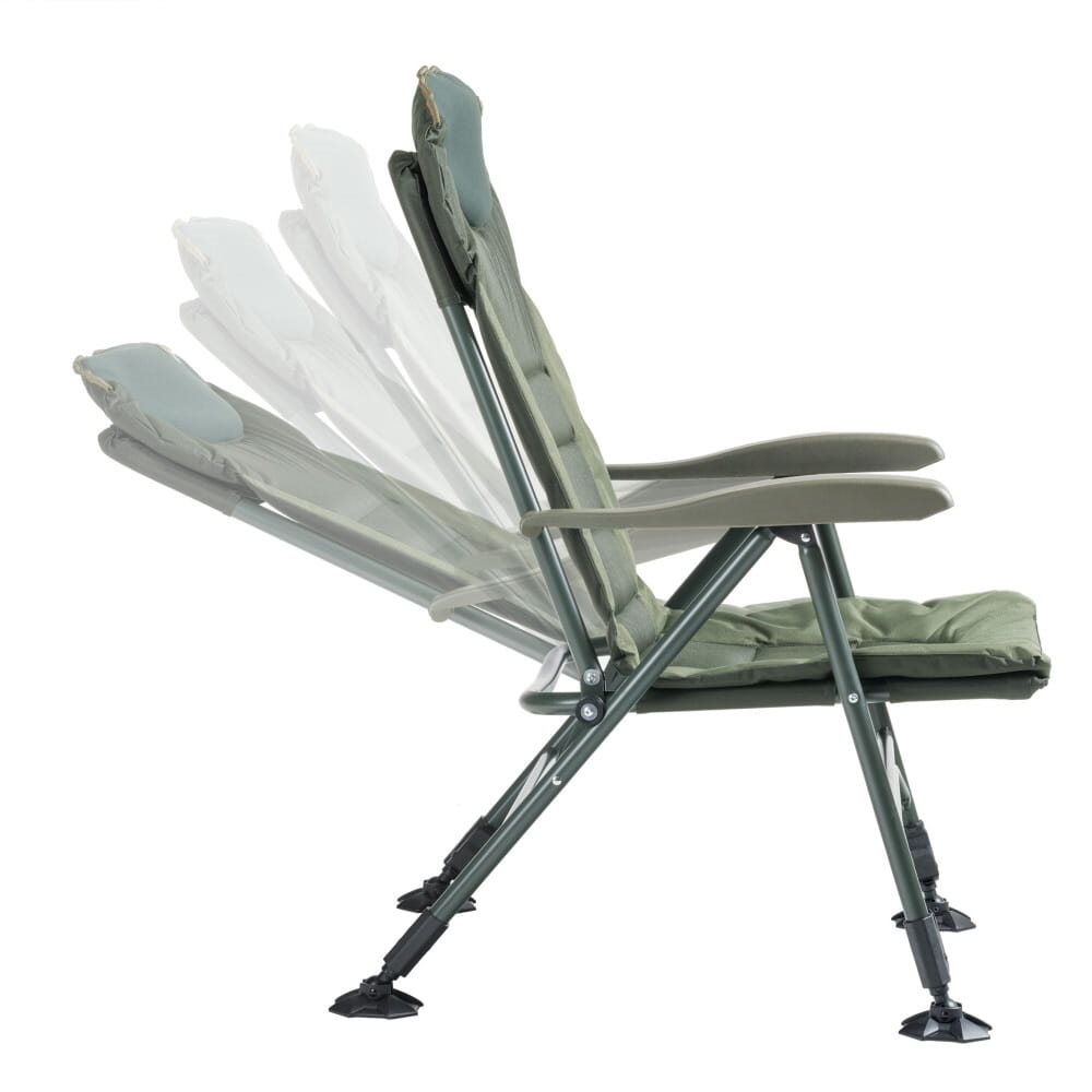 Un fauteuil parfaitement conçu qui répond aux attentes de nombreux pêcheurs. Il est équipé d'un dossier anatomique et d'un coussin en néoprène très rembourré. Les quatre pieds sont télescopiques, équipés d'un système de verrouillage fiable et de grands patins anti-enfoncement. La structure est stable, étonnamment légère et très solide (capacité de charge de 160 kg). Le fauteuil offre un système d'inclinaison confortable du dossier lorsque les accoudoirs sont relevés.