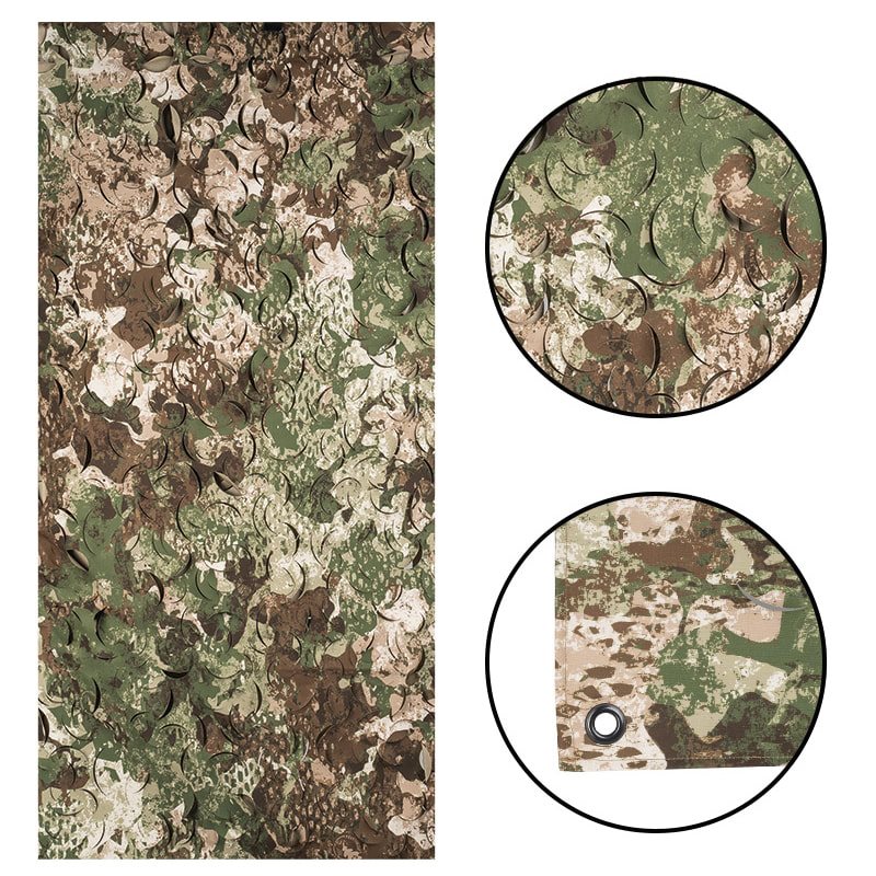 Filet de camouflage léger avec motif découpé au laser. Il convient pour camoufler du matériel, un abri ou pour se protéger du soleil. Le filet est fabriqué en Taslan de haute qualité (100 % nylon moulé à l'air comprimé), qui offre un poids faible tout en conservant une grande résistance. Pour faciliter la fixation, le filet est muni d'œillets métalliques aux coins.