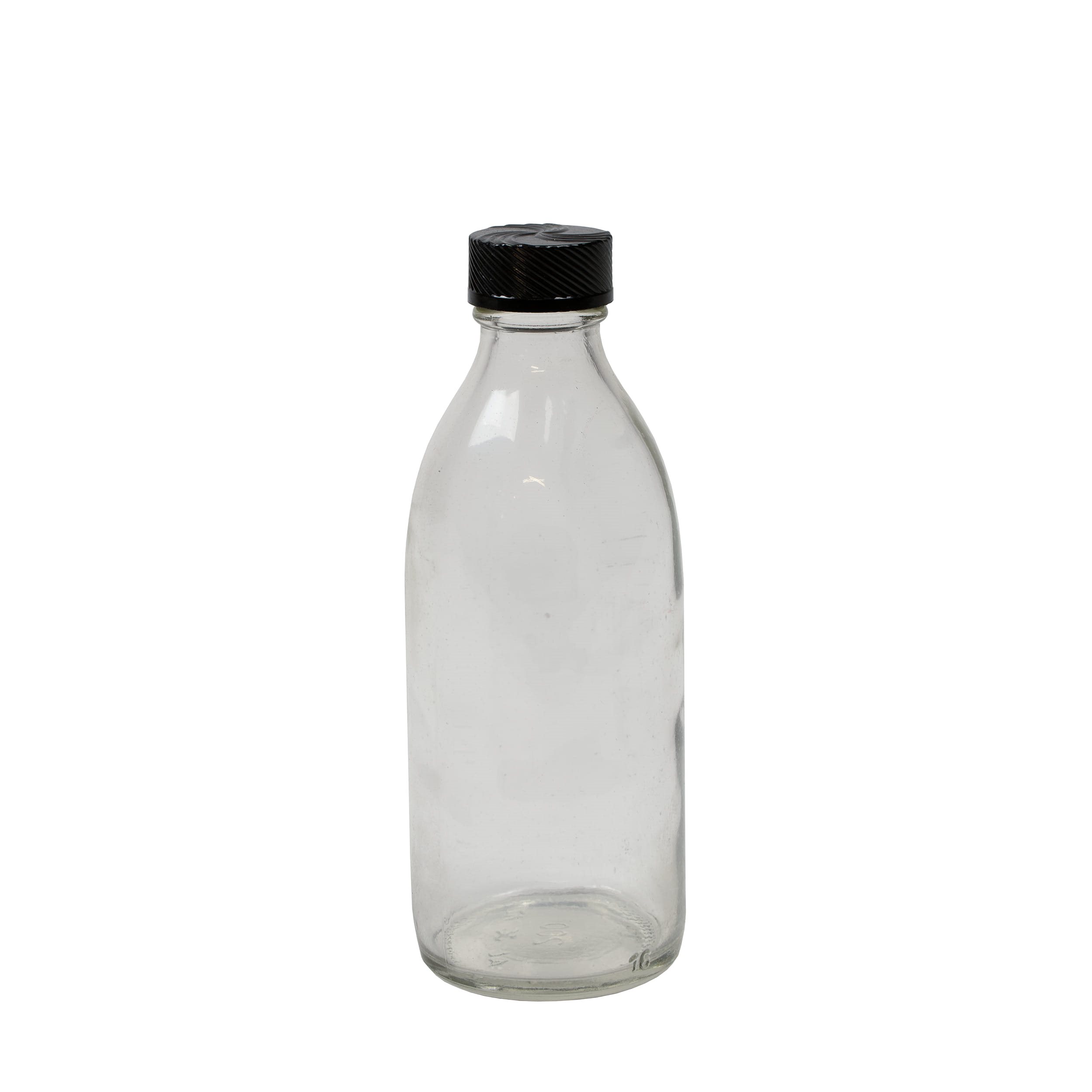 Flacon en verre transparent à col étroit et bouchon en plastique avec joint d'étanchéité. Également connu sous le nom de flacon à médicaments. Plus d'informations