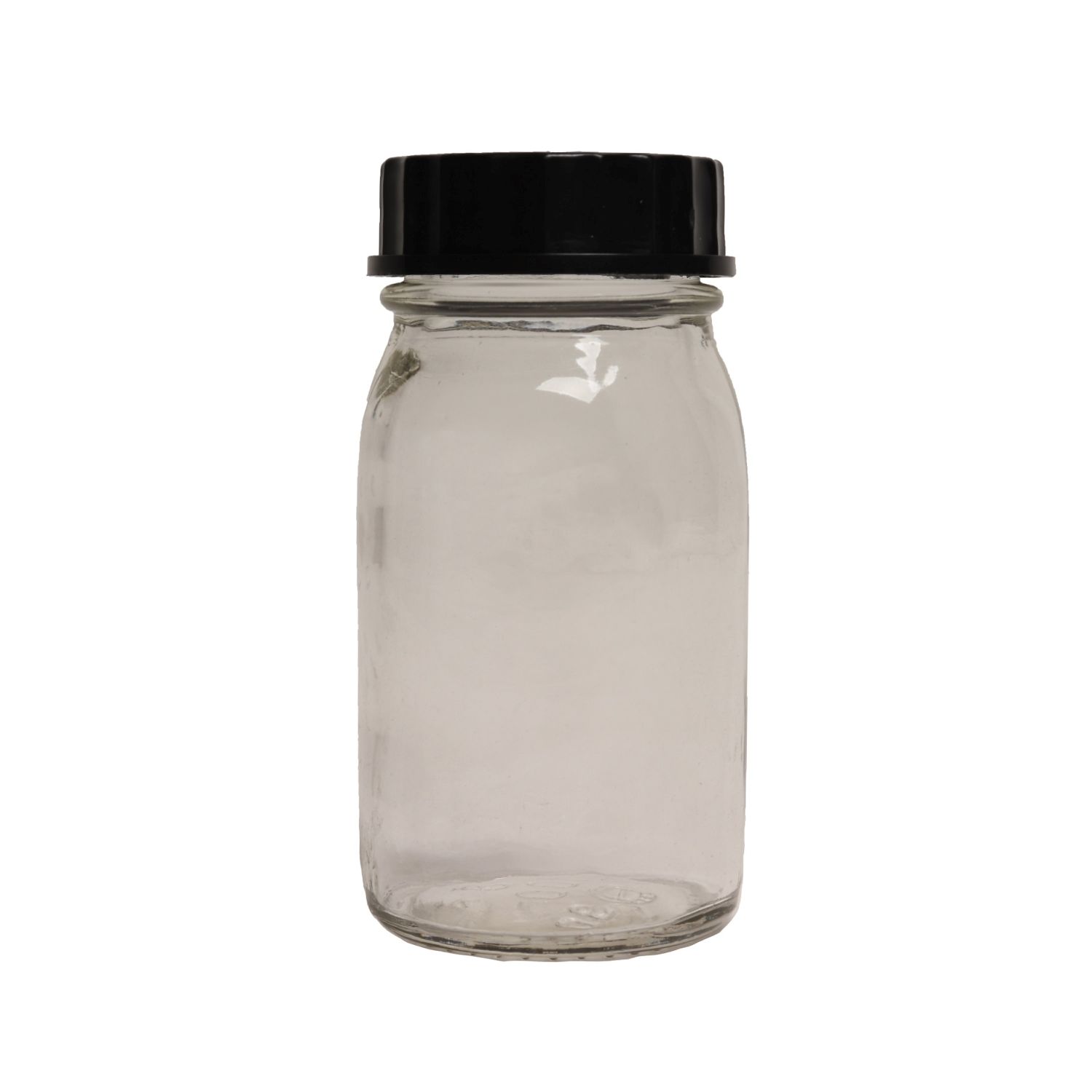 Flacon en verre transparent doté d'un goulot large et d'un grand bouchon en plastique avec joint d'étanchéité.