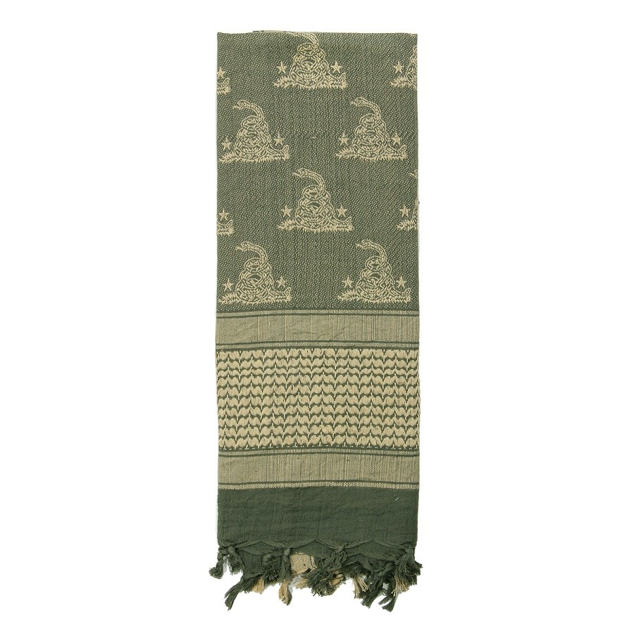 Foulard universel shemag, également connu sous le nom de palestine ou arafat. Au centre du foulard, motif « Gadsden » - nom donné au drapeau historique principalement utilisé aux États-Unis, représentant un serpent à sonnettes. Dimensions : environ 107 x 107 cm, matière : 100 % coton.