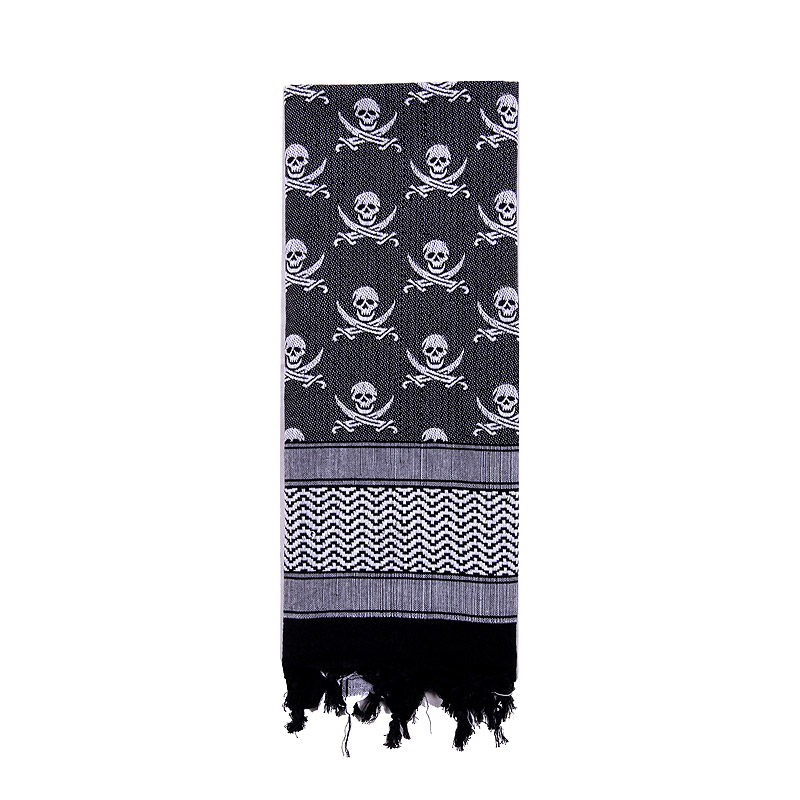 Shemag avec motif tête de mort et os croisés. Dimensions : 107 x 107 cm. Composition : 100 % coton.