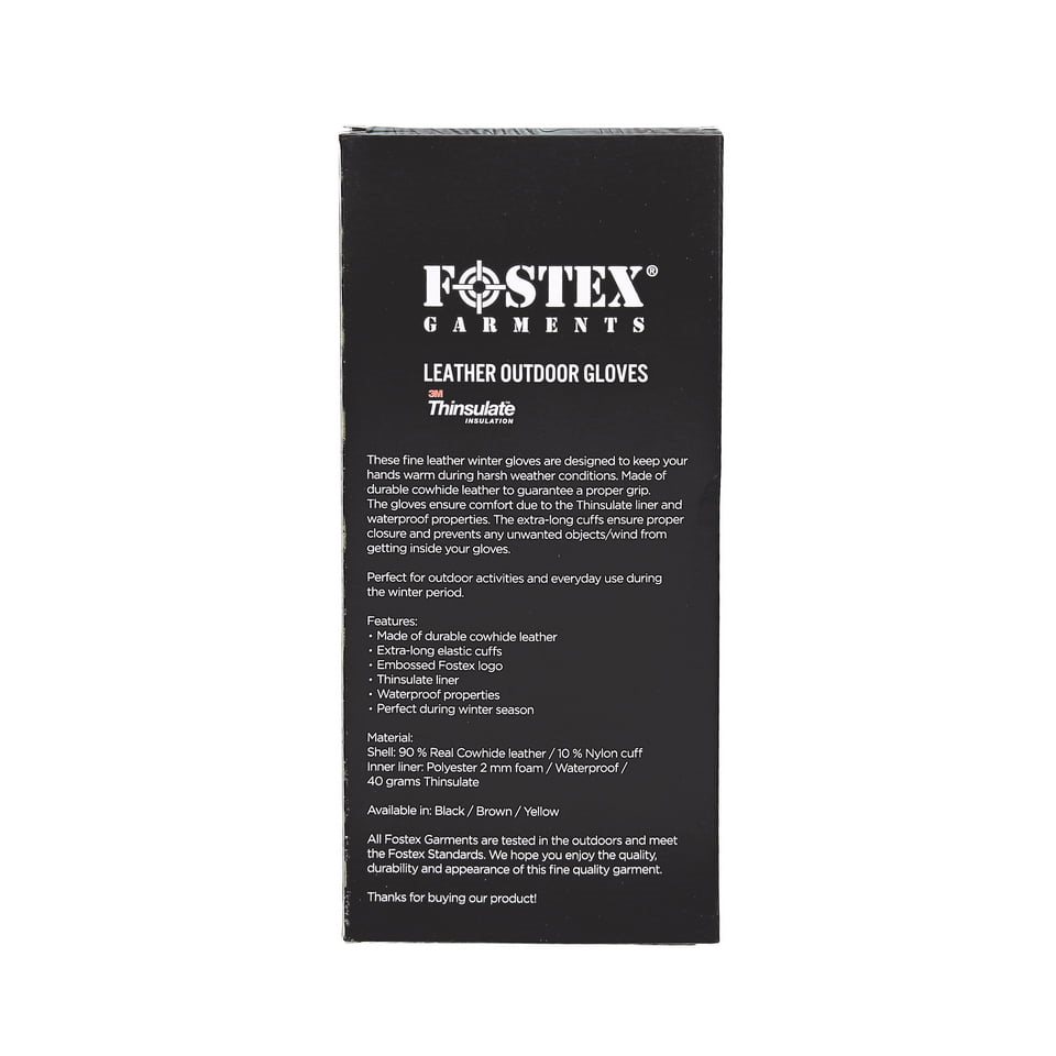 Gants d'hiver en cuir avec doublure chaude Thinsulate 3M, qui vous permettra de garder vos mains au chaud même pendant les journées hivernales les plus froides. La surface extérieure imperméable des gants est fabriquée en cuir de vachette résistant, garantissant une bonne prise en main dans toutes les situations. La manchette des gants est allongée et fabriquée dans un tricot élastique agréable au toucher qui empêche le vent et les saletés de s'infiltrer. Le logo Fostex est estampillé sur le dos des gants.