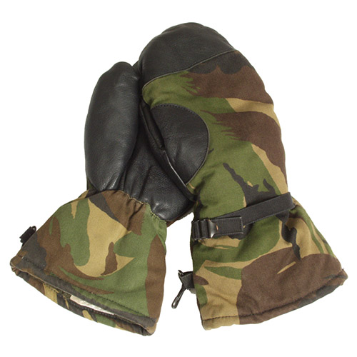 Gants militaires néerlandais originaux isolés. Camouflage néerlandais NL - DPM. Avec cuir aux endroits exposés. Issus d'une liquidation de l'armée néerlandaise.