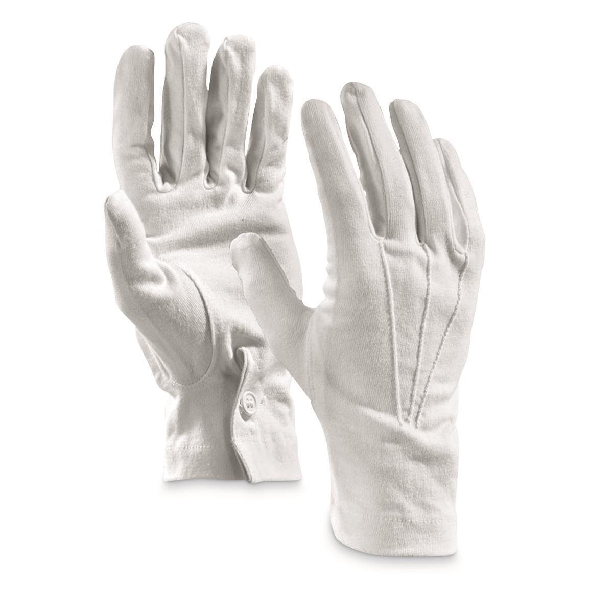 Gants de cérémonie en coton provenant de l'armée italienne. Neufs, jamais utilisés, seulement stockés pendant une longue période. Couleur légèrement crème (ils ne sont pas d'un blanc éclatant).