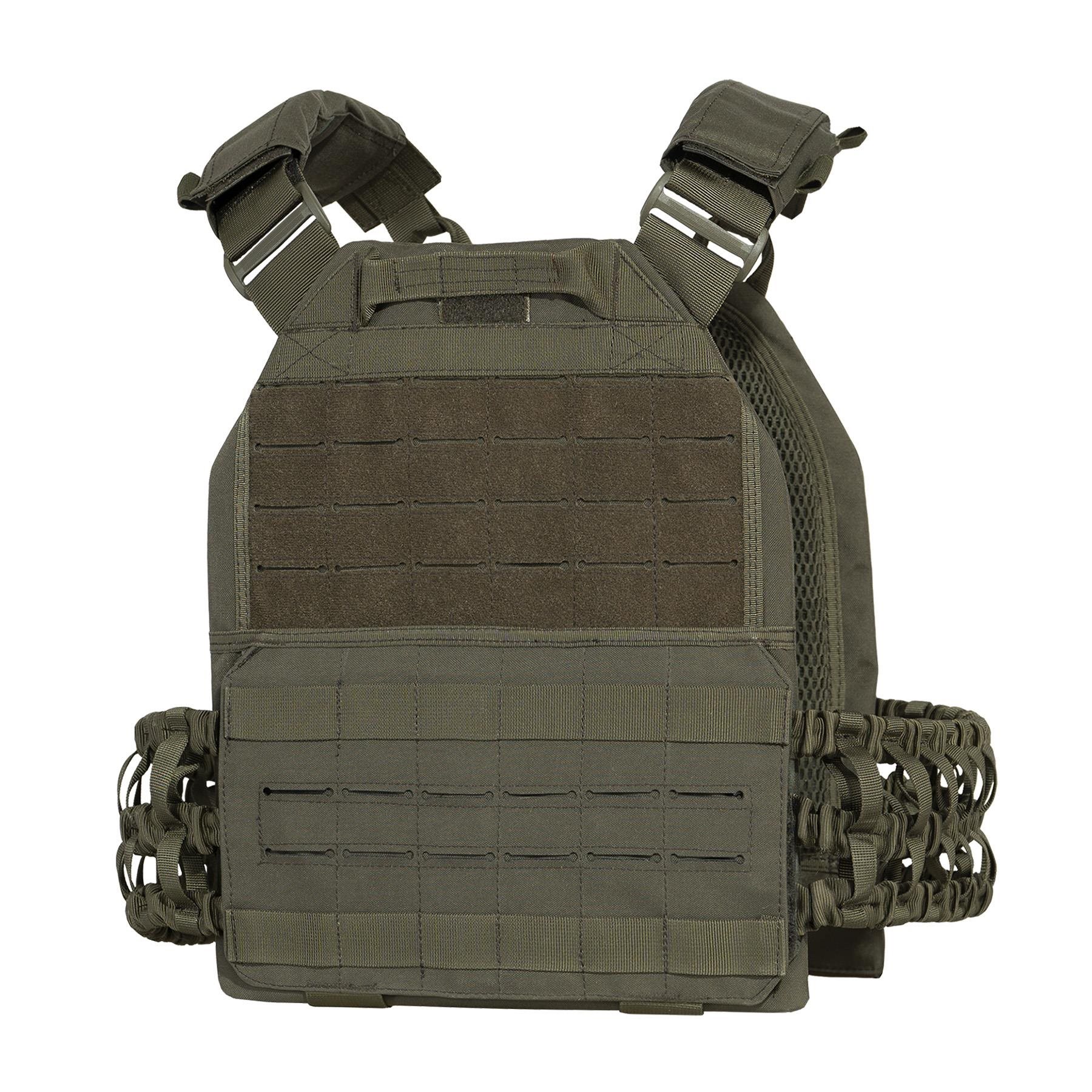 Porte-plaques de conception classique. La fermeture est assurée par des côtés à velcro et un rabat sur la poche avant pour la plaque. Les côtés sont élastiques et légers, tout en permettant la fixation de pochettes compatibles PALS/MOLLE. La poche avant pour plaque est équipée d'une combinaison de sangles classiques et découpées au laser, d'un panneau velcro pour les écussons et de plusieurs boucles verticales pour fixer, par exemple, le bouton PTT d'une radio. La poche arrière dispose également d'une couture classique et laser, combinée à du velcro et une poignée de transport. Les bretelles avec rembourrage amovible sont fixées à l'avant par un œillet en nylon qui sert d'articulation. L'angle des bretelles s'adapte ainsi plus facilement à la morphologie de chacun. Le gilet est conçu pour les plaques SAPI de niveau IV, la position des plaques dans les poches est fixée par une sangle. L'intérieur du support est doublé d'une maille 3D épaisse pour améliorer l'évacuation de la chaleur corporelle.