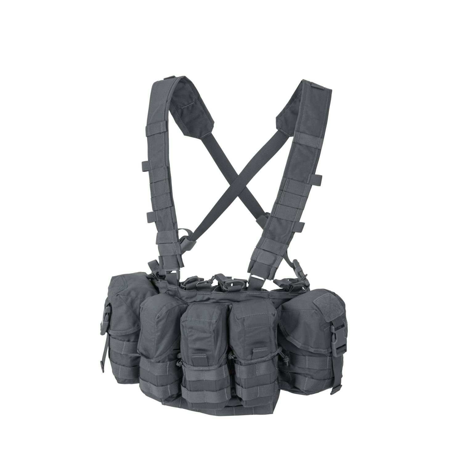 Trois pochettes pour transporter jusqu'à six chargeurs de type AR15, AK, etc. Les pochettes sont fermées par un rabat réglable avec velcro. Le rabat peut être entièrement retiré pour un accès plus rapide, et un cordon élastique avec possibilité de régler la « pression » empêche la perte des chargeurs. À l'intérieur des étuis, il y a une cloison rigide qui empêche les chargeurs de s'entrechoquer. En raison de la conception du rabat réglable, les étuis ne conviennent pas aux chargeurs avec un rebord périphérique ou d'autres protubérances importantes, car ils risquent de se coincer dans la fixation du rabat ou dans la cloison. Deux étuis universels pouvant être utilisés pour un bidon américain, un IFAK, etc.