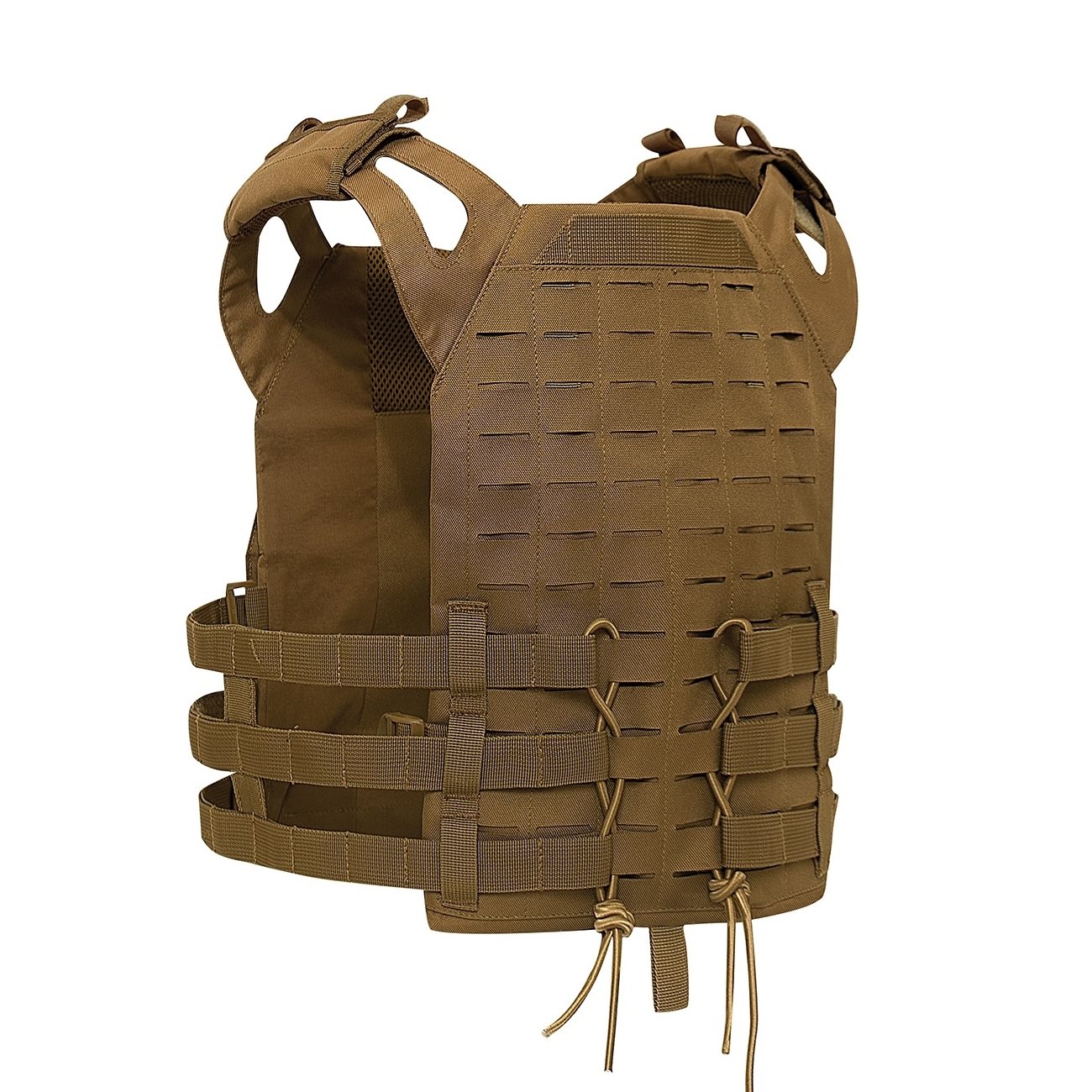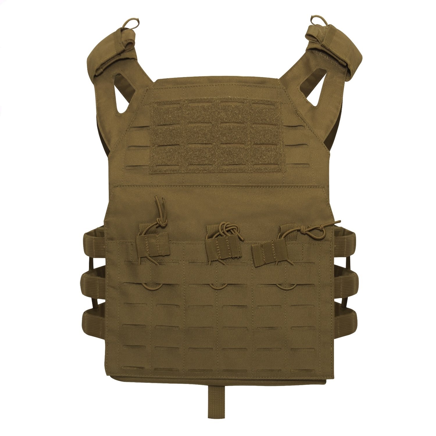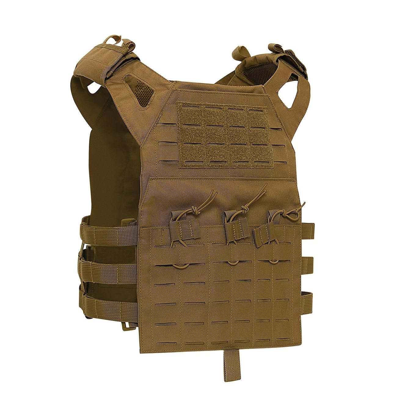 Sous la poche avant, il y a de la place pour 3 chargeurs, qui sont fixés par un cordon élastique. Sur la face extérieure, on trouve un système modulaire LASER CUT MOLLE, qui se trouve également à l'arrière du gilet. Sur les côtés du gilet, il y a 3 autres rangées de sangles MOLLE. Le gilet peut être ajusté à différentes morphologies. Les bretelles peuvent être réglées à l'aide de velcro et permettent également de fixer un tuyau de poche d'hydratation.