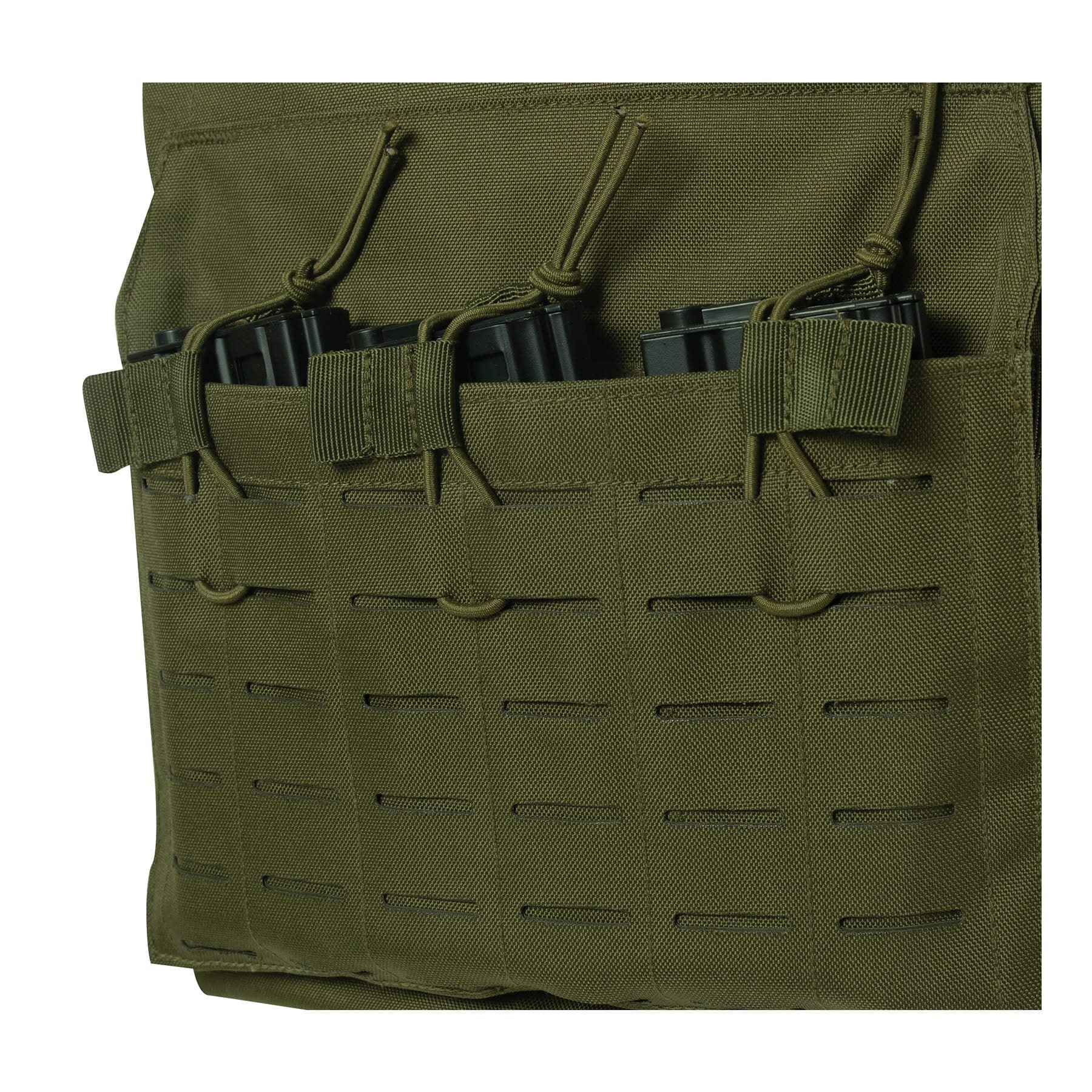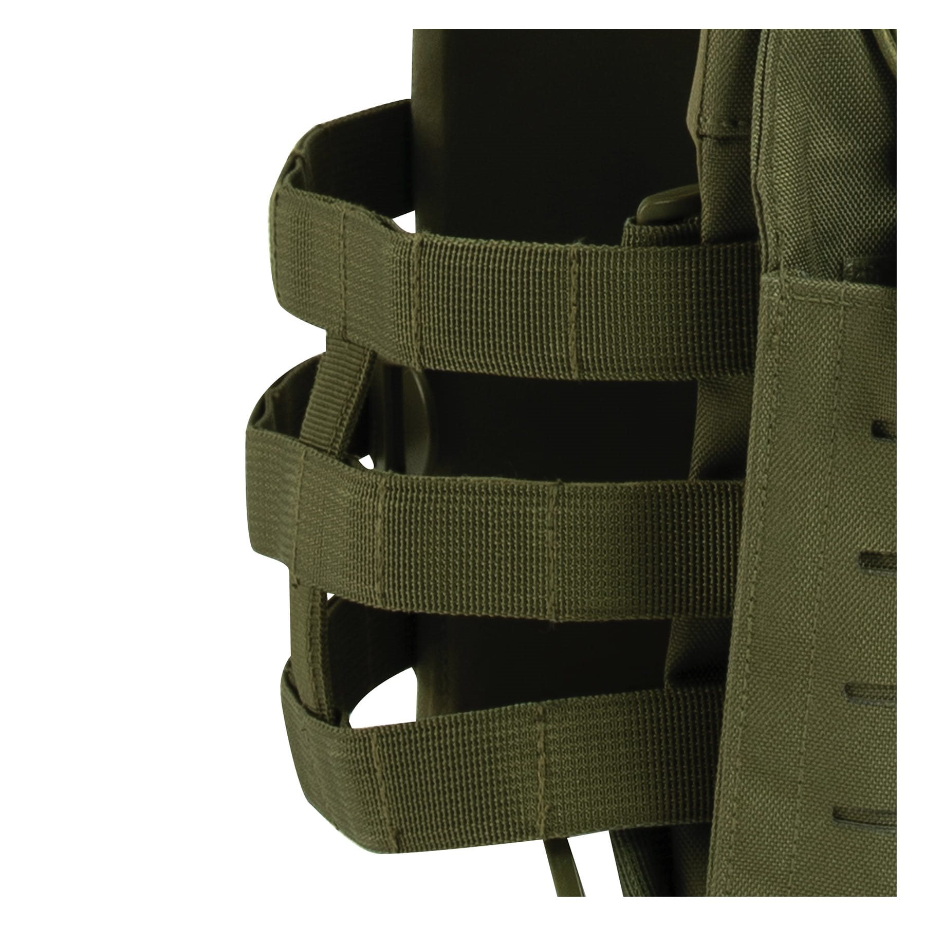 Sous la poche avant, il y a de la place pour 3 chargeurs, qui sont fixés par un cordon élastique. Sur la face extérieure, on trouve un système modulaire LASER CUT MOLLE, qui se trouve également à l'arrière du gilet. Sur les côtés du gilet, il y a 3 autres rangées de sangles MOLLE. Le gilet peut être ajusté à différentes morphologies. Les bretelles peuvent être réglées à l'aide de velcro et permettent également de fixer un tuyau de poche d'hydratation.