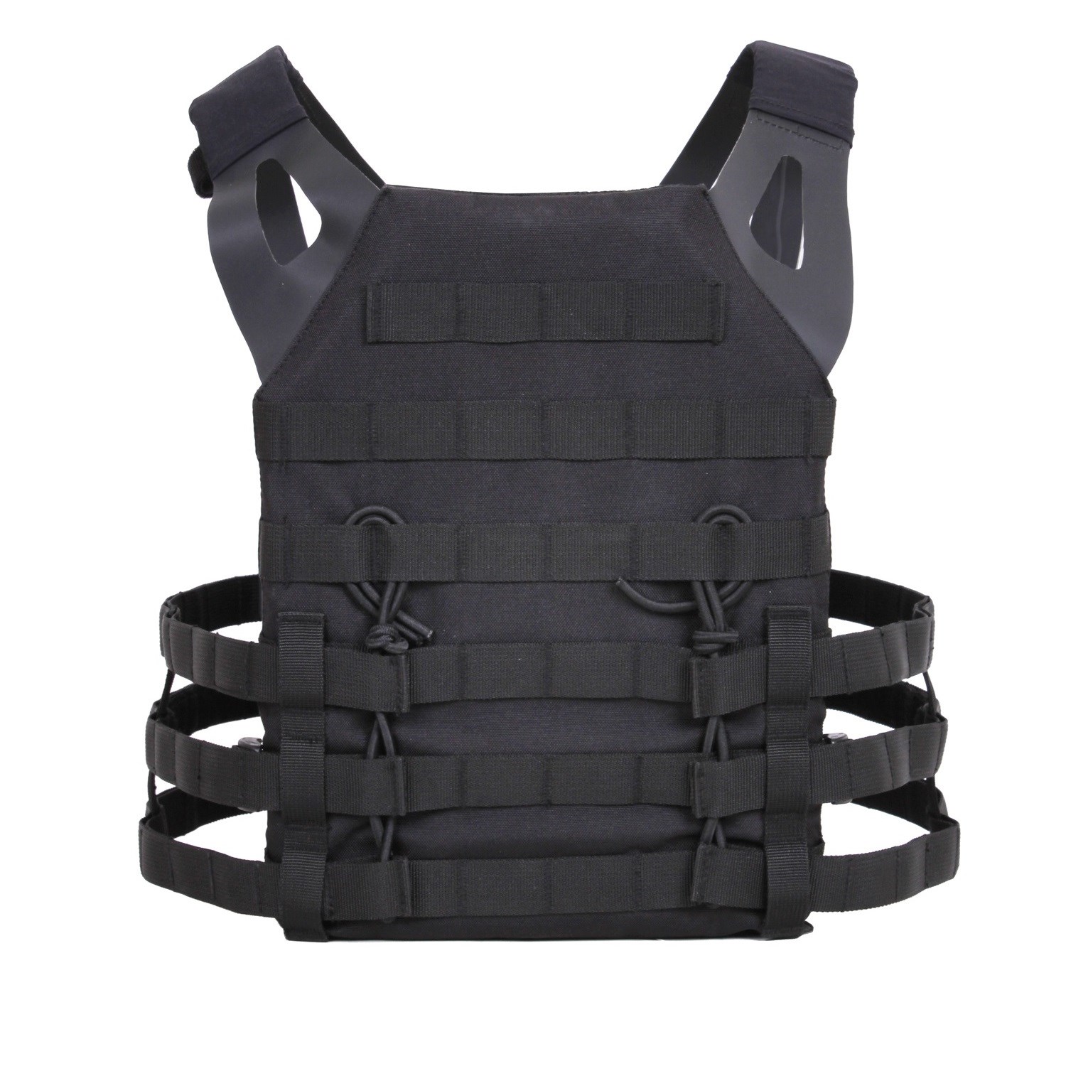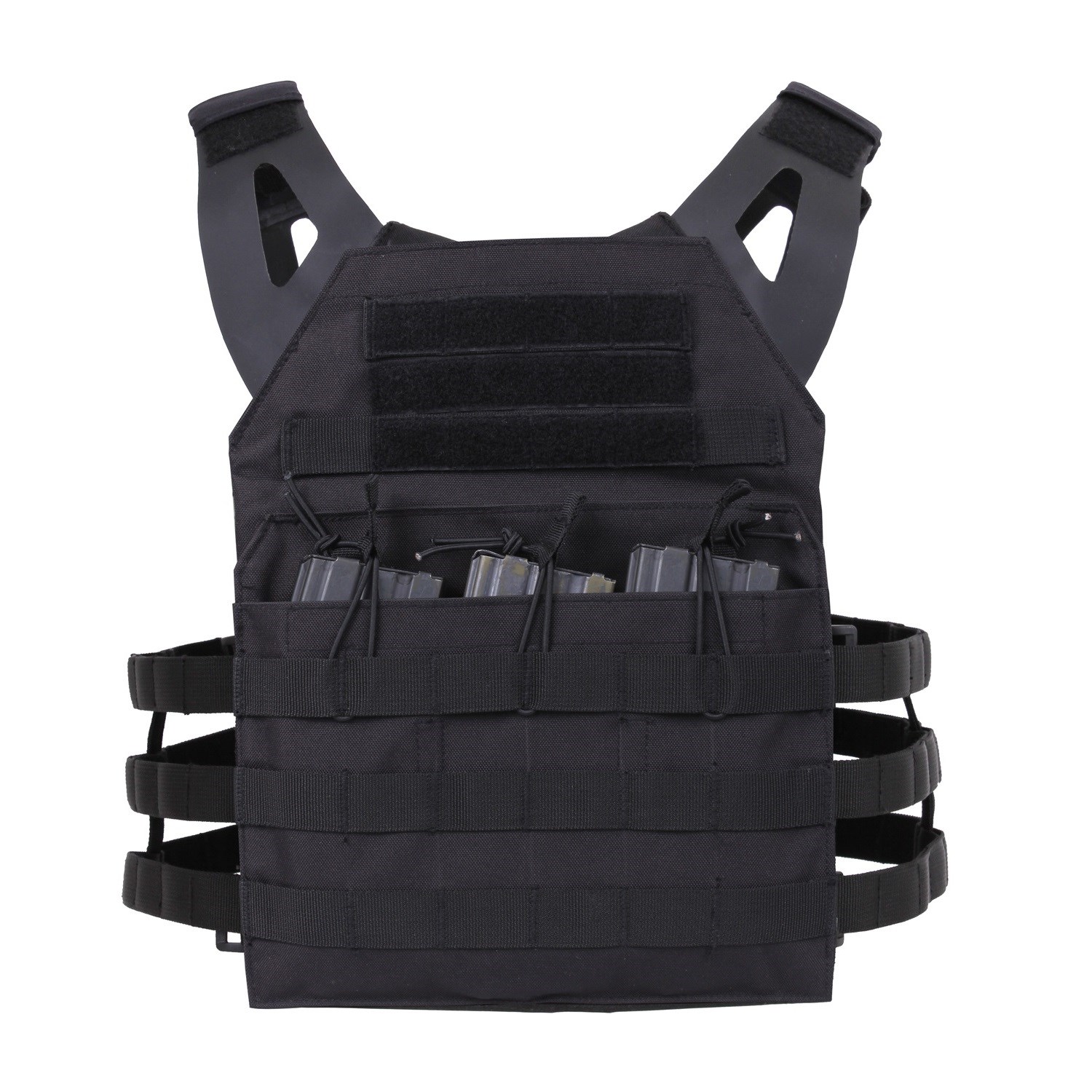 Sous la poche avant, il y a un espace pour 3 chargeurs, qui sont fixés par un cordon élastique. Sur la face extérieure, on trouve un système modulaire MOLLE, qui se trouve également à l'arrière du gilet. Sur les côtés du gilet, il y a 3 autres rangées de sangles MOLLE. Le gilet peut être ajusté à différentes morphologies. Les bretelles peuvent être réglées à l'aide de velcro et permettent également de fixer un tuyau de poche à eau.
