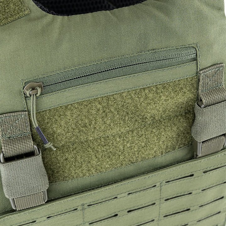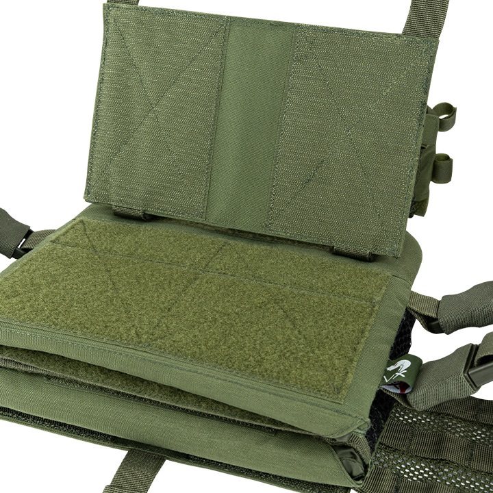 L'avant et l'arrière du support sont recouverts d'une liaison MOLLE/PALS qui vous permet de fixer toute une série d'équipements compatibles. Le panneau avant de la liaison peut être remplacé si nécessaire, ou retiré et non utilisé. Au-dessus du panneau avantMOLLE se trouve un panneau VELCRO pour vos écussons et une petite poche administrative plate adaptée aux petits documents. Les boucles FASTEX compatibles avec le système VX offrent une autre possibilité de fixation d'équipements supplémentaires.